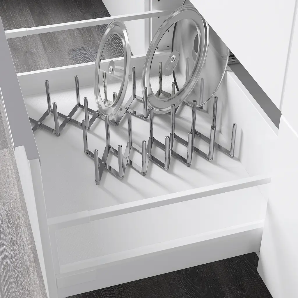 VARIERA Pot lid organizer - stainless steel. Keeps pot lids organized and easy for you to find. You can customize the length based on your storage needs. Enjoy a quieter kitchen with less noise from clanking pot lids.
