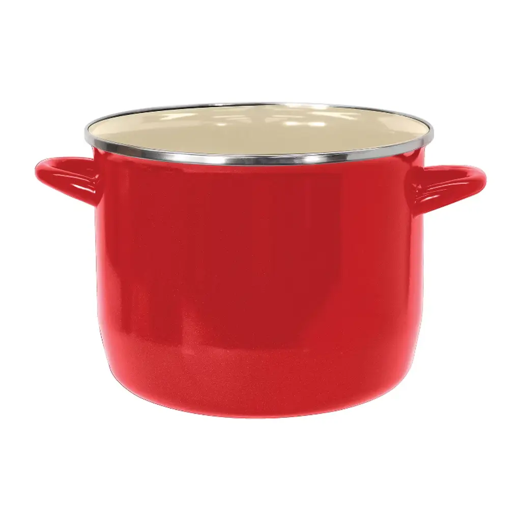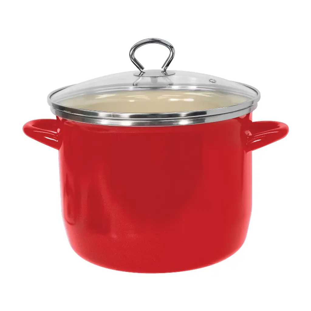 The Vasconia 8-Qt. Red Stockpot is made with premium enamel on steel. This heavy-weight steel stockpot with a hard and glossy exterior is 7x stronger than traditional aluminum stockpots. An enameled interior makes cooking and cleanup a breeze. The 7-layer enamel exterior makes the cookware scratch-resistant and will maintain its shine. Enamel-on-steel handles complete the elevated look. The glass lid comes with a stainless steel handle. It's oven safe up to 480°F. This stockpot is truly a versatile piece that can be used to cook up just about anything, anywhere (grill, stovetop, or oven). The pretty exterior means you can bring it straight to the table for serving too.
