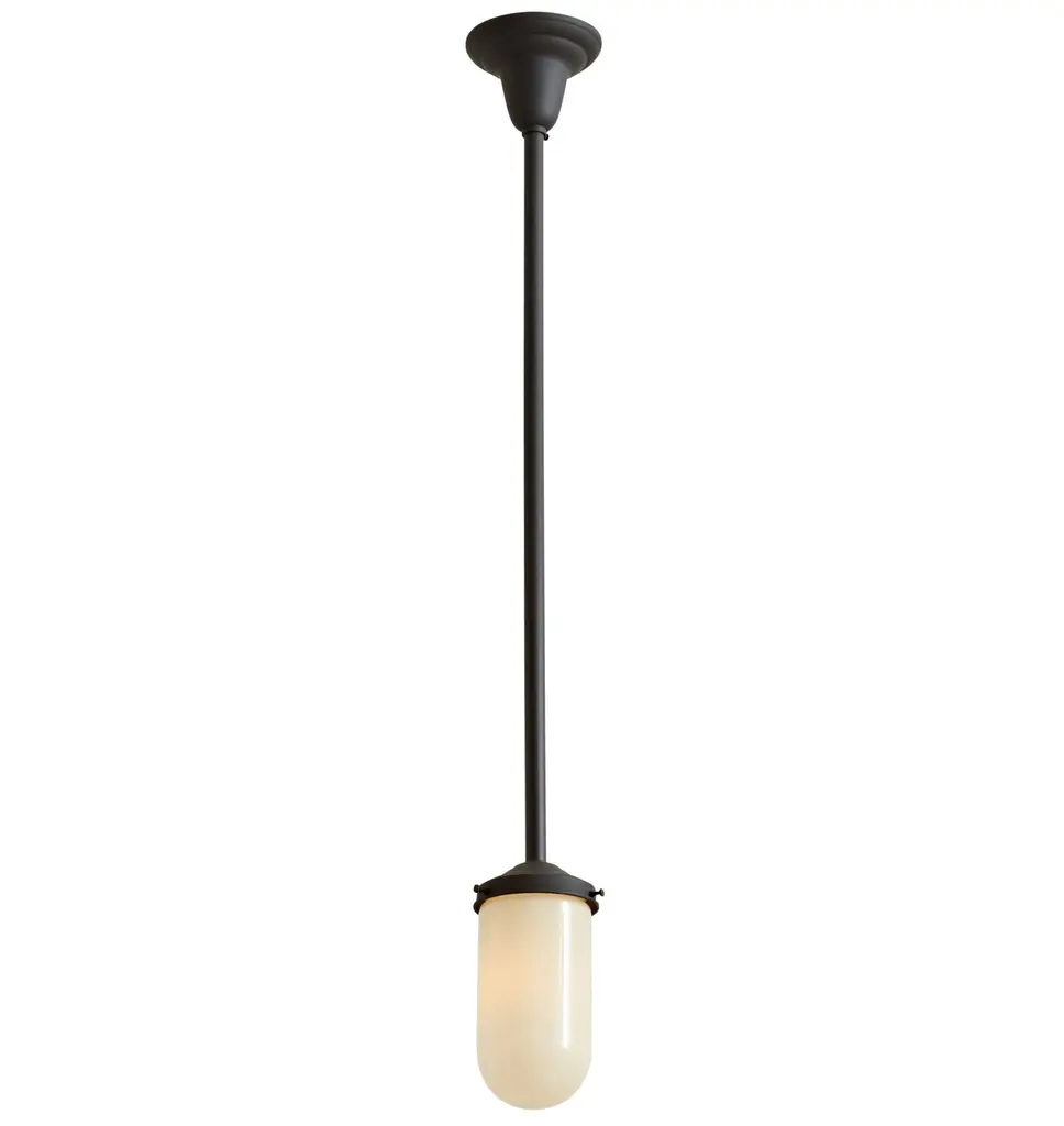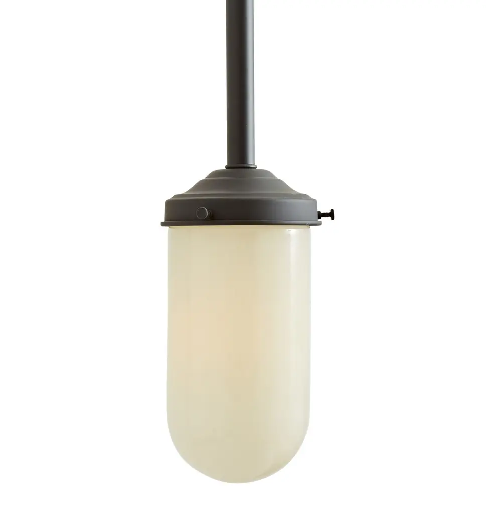 Circa 1920 An understated alternative to the many highly stylized and ornamented lighting variations, Traditional lighting represents a more accessible, everyday design aesthetic. Simple flush mount, bead-chain and center-post fixtures with relatively unadorned shades are among the most common forms of Traditional lighting, ubiquitous in less formal parts of the 20th century home. The Traditional lighting we offer is carefully sourced and restored by our knowledgeable Antiques & Vintage team. Details You'll Appreciate Fully restored and rewired in our Portland, Oregon Antiques & Vintage shop Historical Style: Traditional Customizable Light The length of this light can be customized to work for your space. Once you've selected your light, simply email oldstuff@rejuvenation.com with proof of purchase to discuss options. Surcharges may be added. Current Length: 41" Shortest Possible Length: 15" Product Specifications Condition Notes: New pendant finished in Matte Antique paired with vintage vaseline glass bullet shade. Bulbs not included