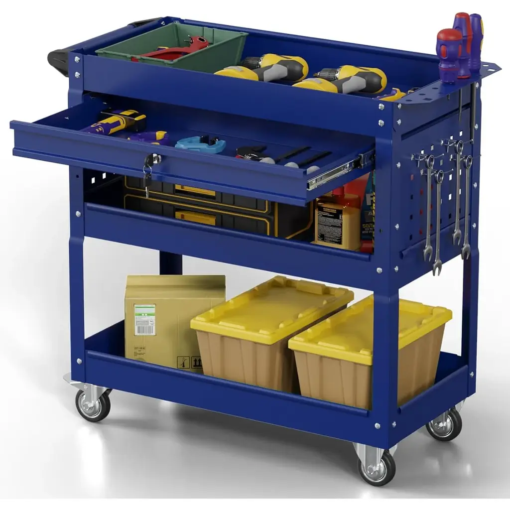 Streamline your workspace with this 5-drawer multifunctional tool cart, designed for both durability and convenience. Built from sturdy metal with a sleek black and blue powder-coated finish, it offers excellent wear resistance and a professional appearance. The smooth ball-bearing drawers provide easy access to tools, while the lockable design keeps contents secure during transport or storage. Equipped with four swivel wheels - two with brakes - it moves effortlessly around your garage or workshop. This tool cart also features a modular hook system, allowing you to connect it with additional units for a customizable and expandable storage solution.