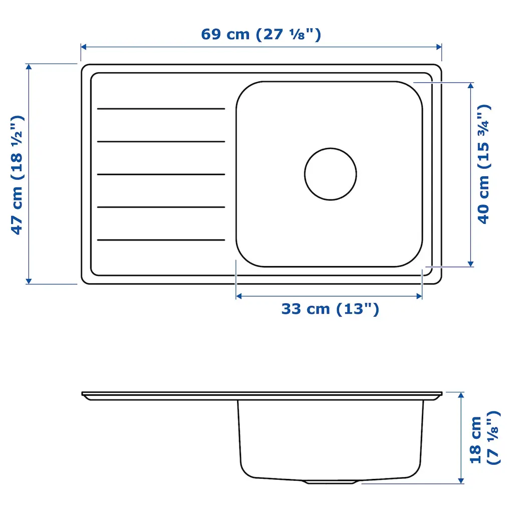 VATTUDALEN Single bowl top mount sink - stainless steel 27 1/8x18 1/2 ". 25-year Limited Warranty. Read about the terms in the Limited Warranty brochure. This sink has a sloping drain board, so that excess water from dishes flows back into the bowl. Can be under-mounted.