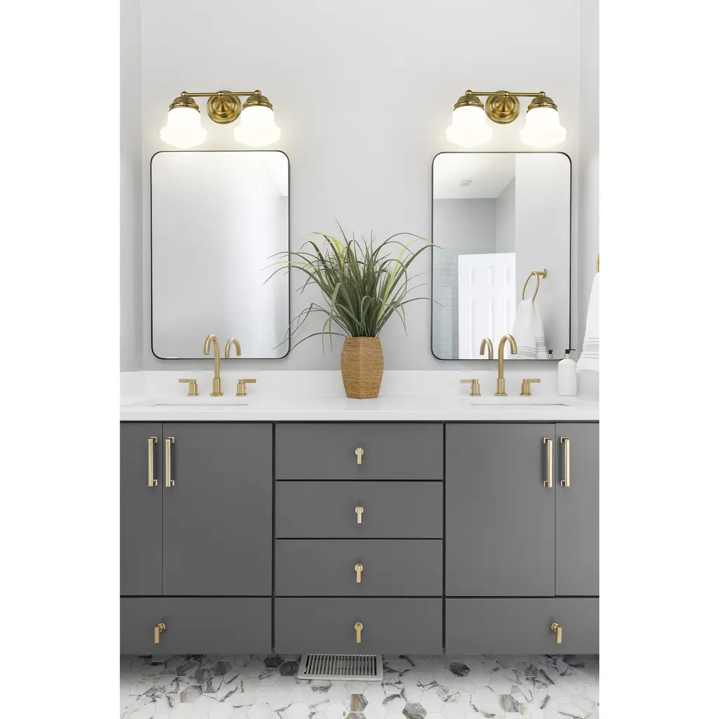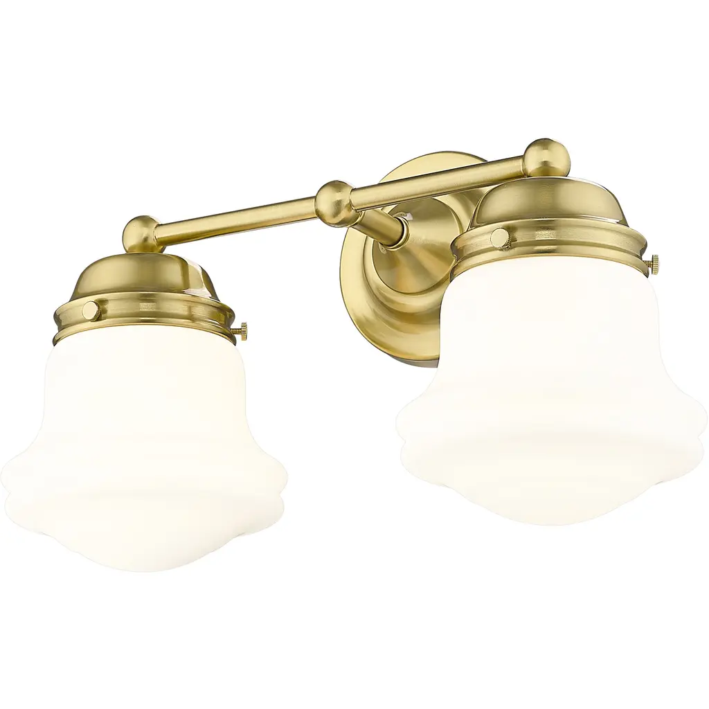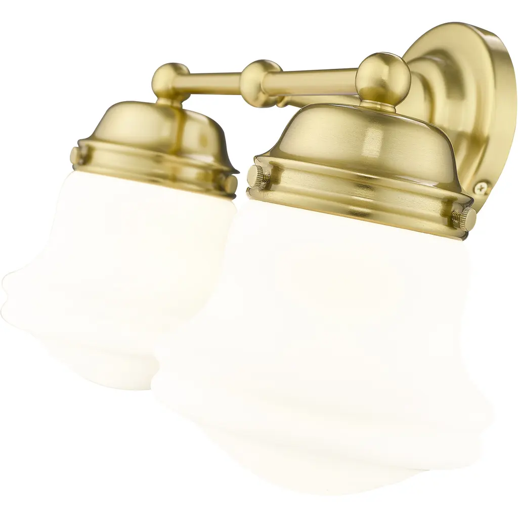 A perfect choice flanking a vanity or in a dressing area, this modern two-light wall sconce showcases Mid-Century Modern character. Schoolhouse-style glass overflows with personality, offering both vintage aesthetics and lovely, diffused illumination. The fixture is defined with a warm luxe gold finish that complements in virtually any home.