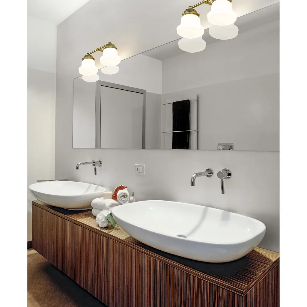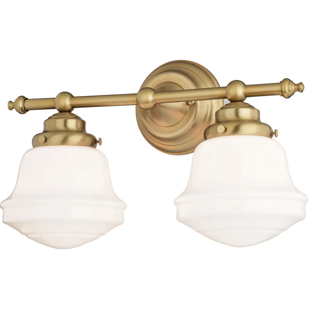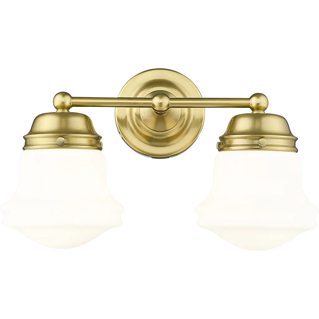 A perfect choice flanking a vanity or in a dressing area, this modern two-light wall sconce showcases Mid-Century Modern character. Schoolhouse-style glass overflows with personality, offering both vintage aesthetics and lovely, diffused illumination. The fixture is defined with a warm luxe gold finish that complements in virtually any home.