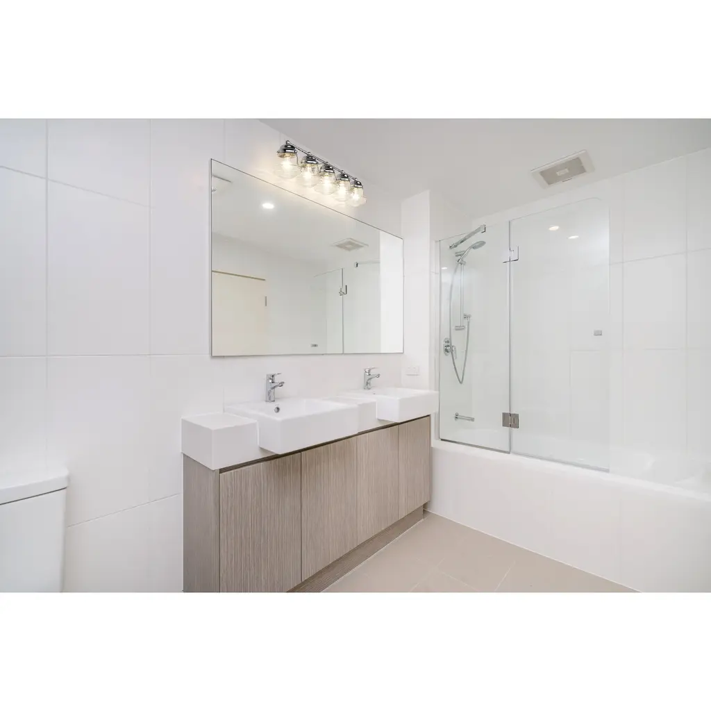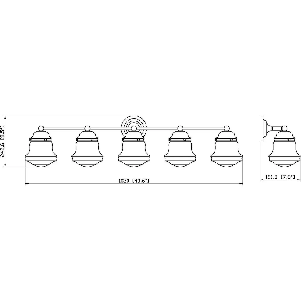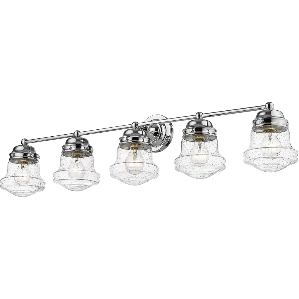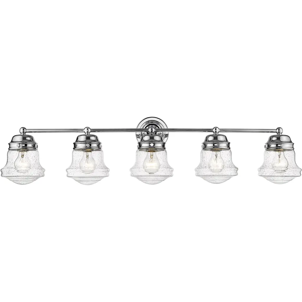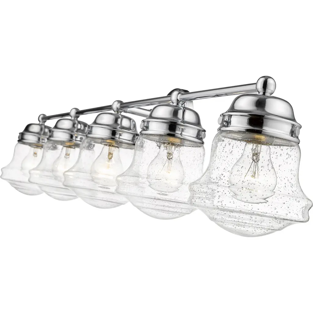 A large vanity calls for big style, and this transitional five-light bath vanity light delivers. With a charming village industrial motif, it incorporates a bit of nautical attitude and contrasts gleaming chrome finish steel with unique schoolhouse style shades made of romantic clear seedy glass. This light from the Vaughn collection transforms the overall aesthetic of any bath space.
