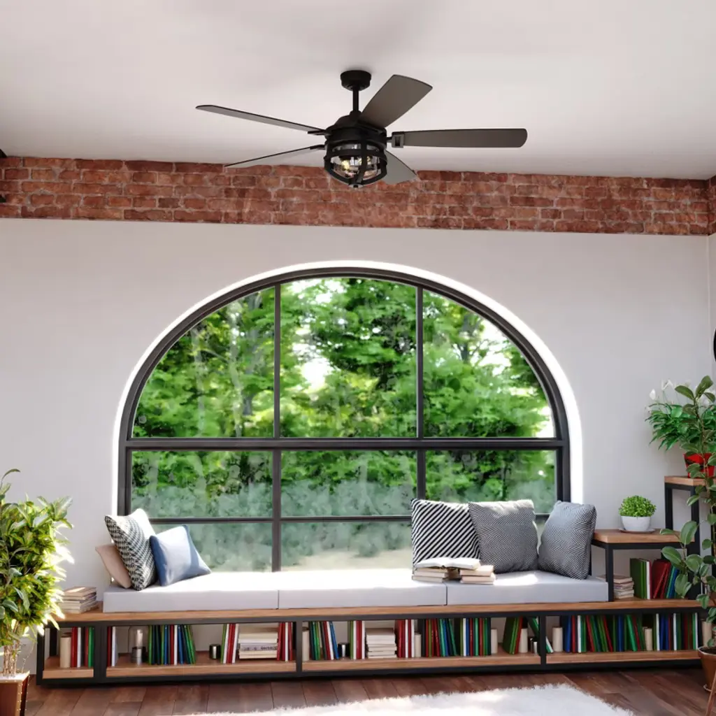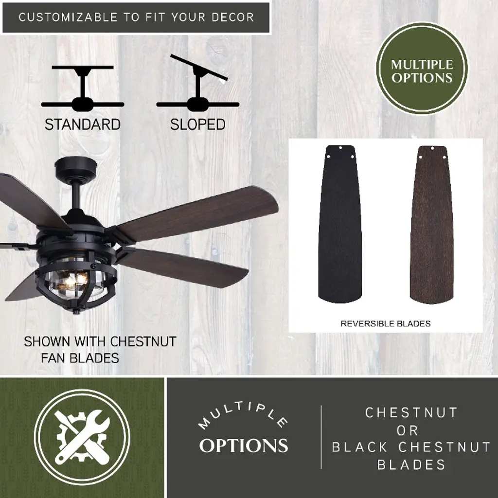 Farmhouse styling gives the Barnes 54-in. ceiling fan a unique twist on an old favorite. The matte black cage surrounds a clear seeded glass shade. Five reversible blades in black chestnut or regular chestnut finish create an industrial feel. Vintage Edison style filament bulbs complete the look. Wet rated for indoor and outdoor spaces, this farmhouse fan is ideal for many areas including great rooms, living rooms, and outdoor areas.