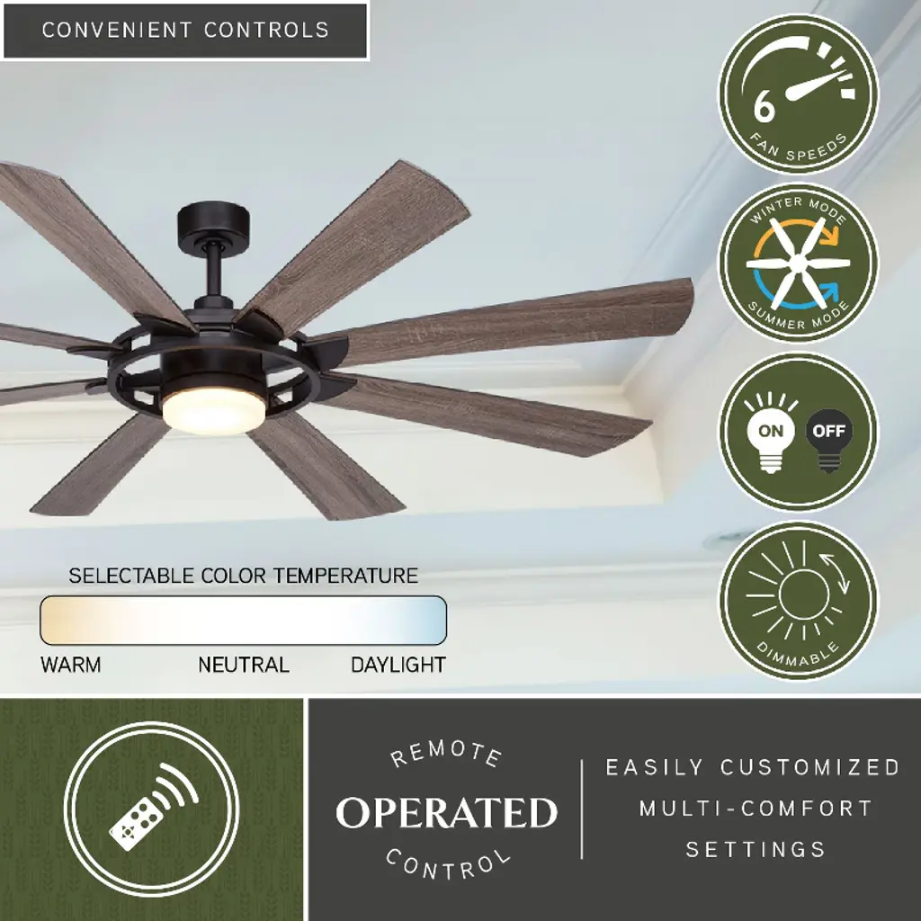 Do not let the simplicity of the Burlington ceiling fan fool you! The Burlington offers an understated farmhouse look to any home. A new bronze finish and frosted white integrated light adds a flavor of old world charm. Switch up your look with the eight reversible blades of driftwood or walnut colors. An integrated LED light source provides energy saving, no bulb changing convenience, low maintenance and long-lasting performance. Remote control included, height adjustable with longer downrod (sold separately), sloped ceiling compatible. At 68 inches, this large windmill style ceiling fan is ideal for great rooms, vaulted ceilings, or any other living space.