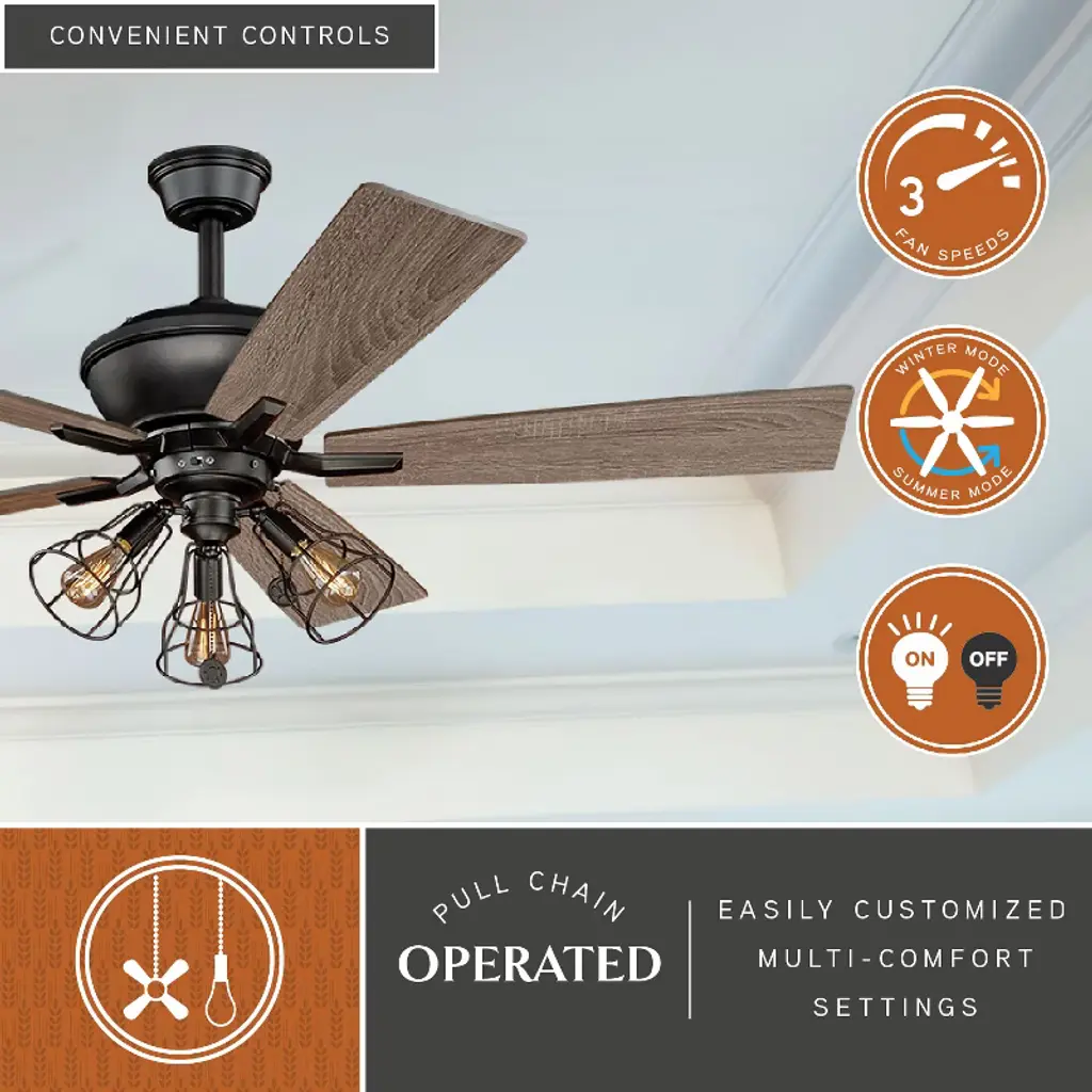 The Clybourn ceiling fan in a bronze finish has a distinct farmhouse or industrial look. The included light kit features 3 distinct wire cage directional lights over dimmable vintage Edison style filament bulbs (included). Attractive reversible driftwood or dark maple blades allow you to change up the look. A pull chain makes it easy to control the speeds. This fan is perfect for any living room, kitchen, or office. Can be alternatively installed without the light kit. It is compatible with sloped ceilings and includes a 6 inch down rod (longer down rods sold separately).