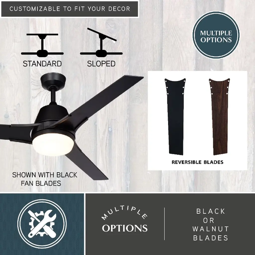 Form and function coexist in the Crescent. Reversible black or walnut wood fan blades are showcased in this versatile ceiling fan. Blunt ended blades merge toward a center focal point, where light warmly emits from a frosted white shade. Casual, yet classy, the Crescent collection is well suited to bring any modern home an extra pop of style. Damp rated for outdoor or indoor use, add this stylish fan to any enclosed patio or porch or indoor living areas.