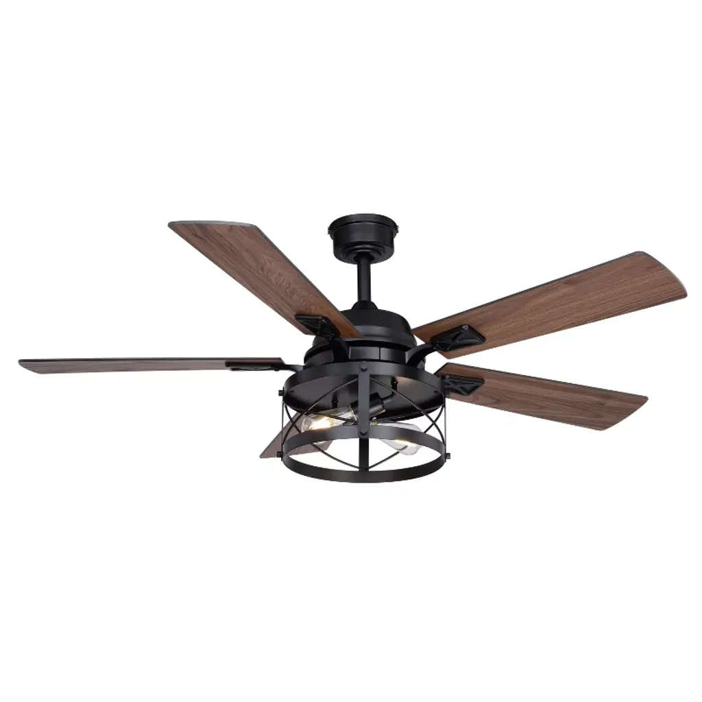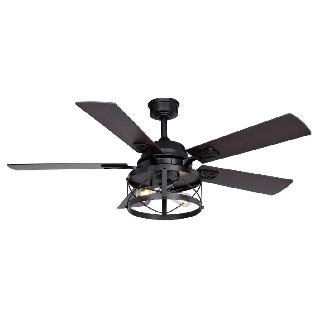 Farmhouse charm is exemplified in the Elburn collection. A black finish strongly accentuates the drum shaped cage shade that sits just below the wooden fan blades. This ceiling fan will bring comfort and warmth to any room in your home.