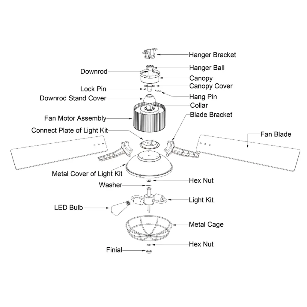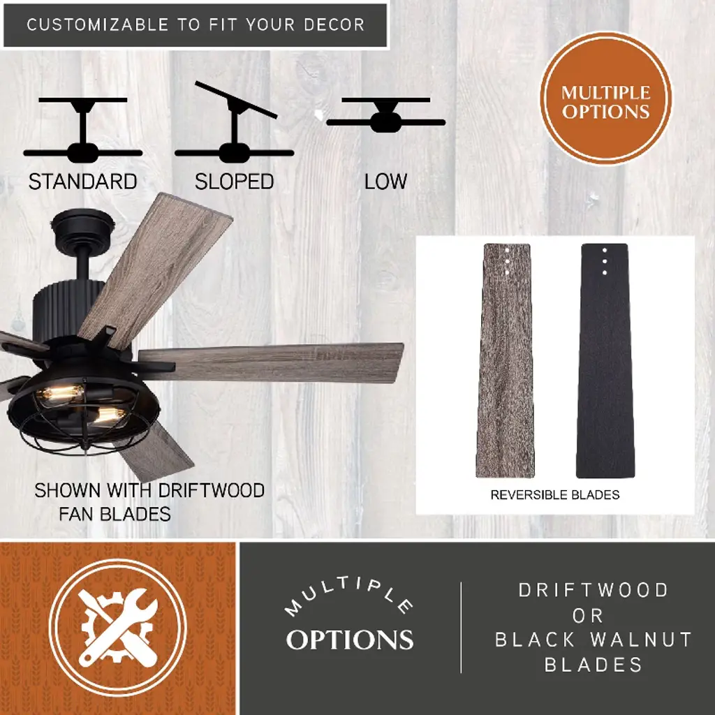 The Elkhart ceiling fan's corrugated metal detail around the black motor housing and wire cage light kit handsomely complement industrial style indoor decors. Switch up your look with reversible blades of black walnut or driftwood gray colors. Dimmable LED bulbs and a 3-speed remote control are included. This fan is compatible with sloped ceilings and includes a 6 inch downrod (longer down rods sold separately). Ideal for bedroom, kitchen, family room, or other interior living area of your home.