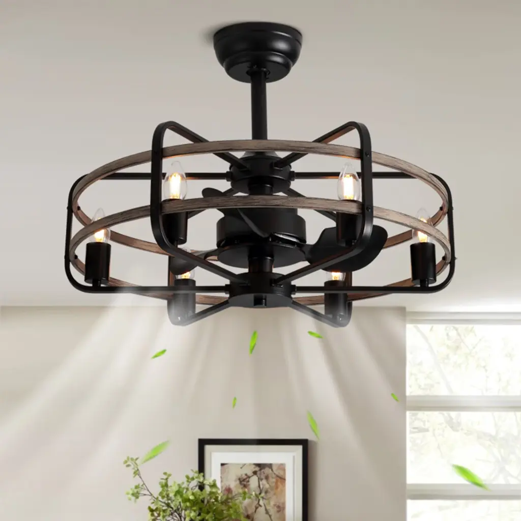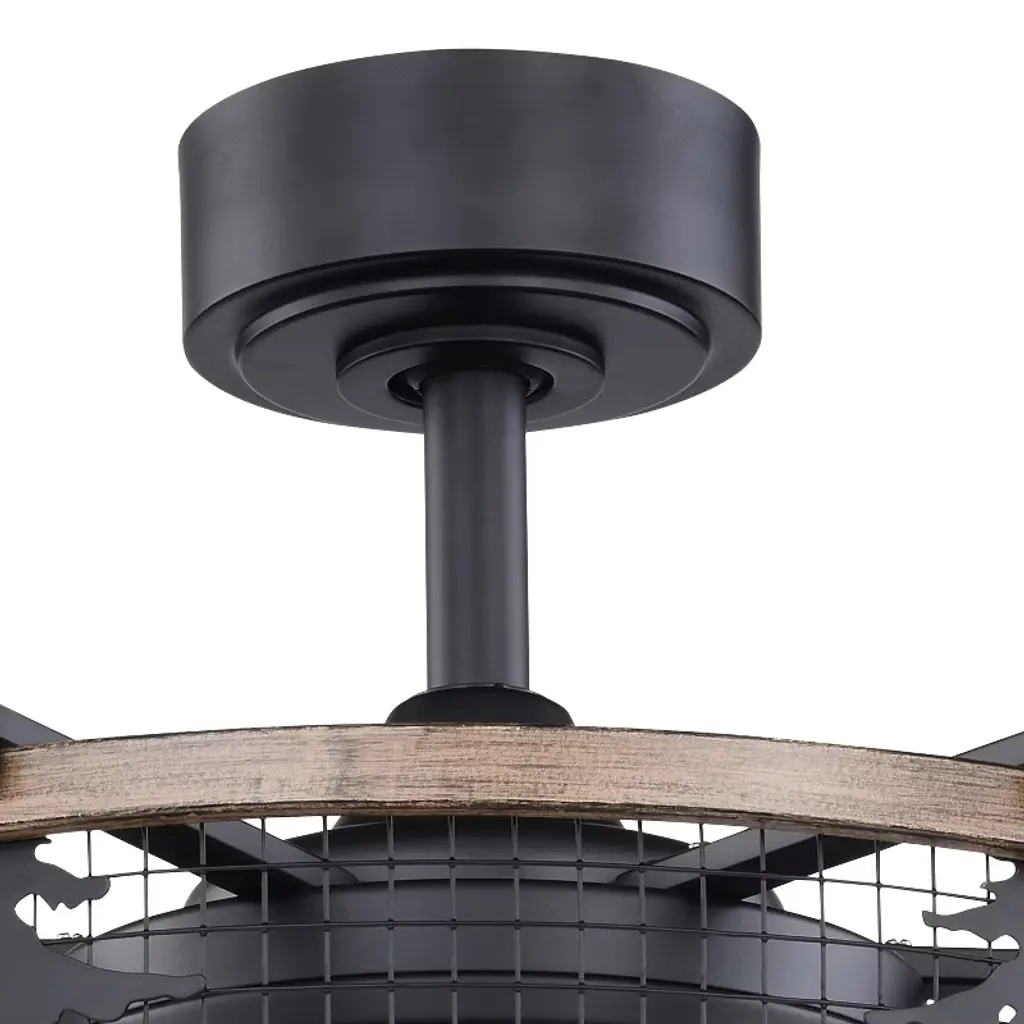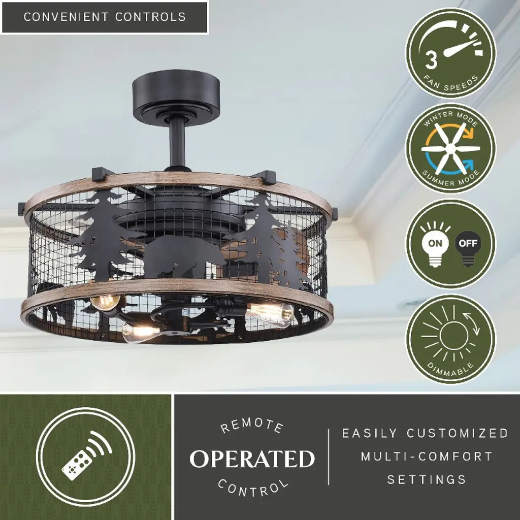 Get wild with this indoor-outdoor drum style fan called Kodiak. The pairing of the black and burnished teak finishes enhance the on-trend metal cage perfectly. Capture your love of nature with pine tree and bear silhouettes. It is a great choice for a vacation lodge, cabin or suburban home and will complement a variety of home styles: anywhere you want to bring an element of nature. An LED light source provides energy saving, low maintenance and long-lasting performance. Combine that with vintage Edison style filament bulbs to complete the look. Rated for damp locations, ideal for your covered porch, family room, or any other area of your home.