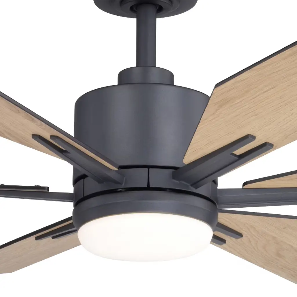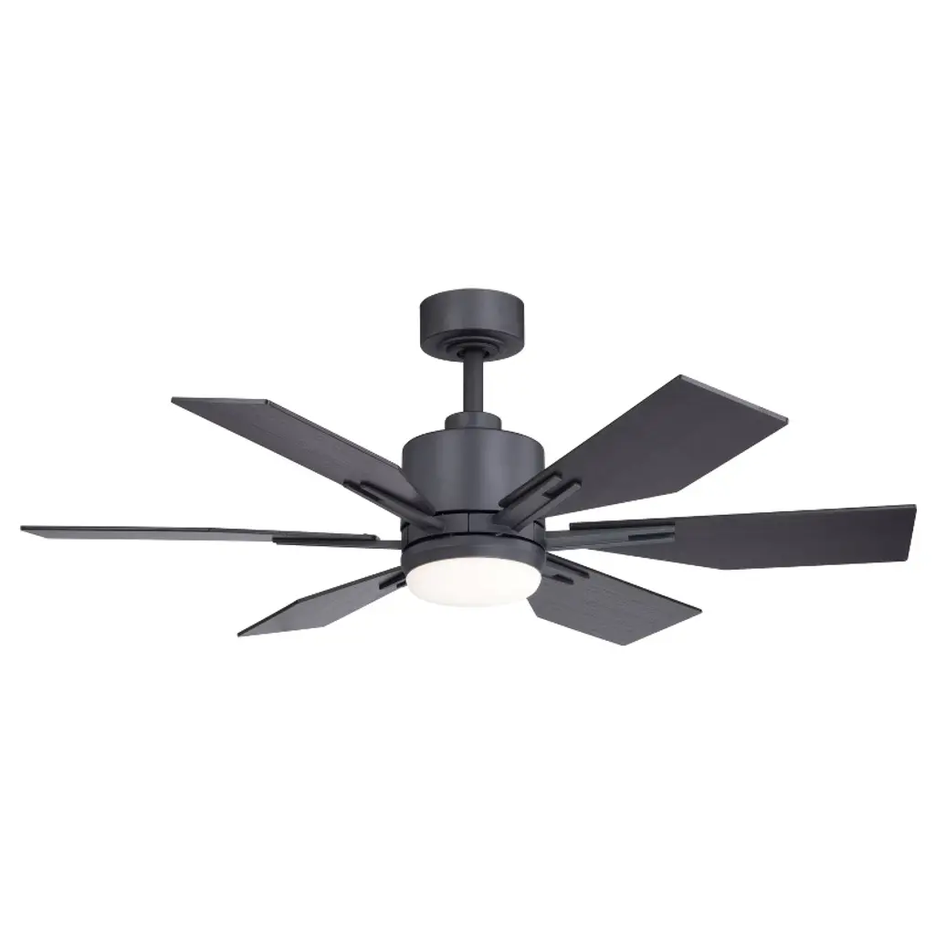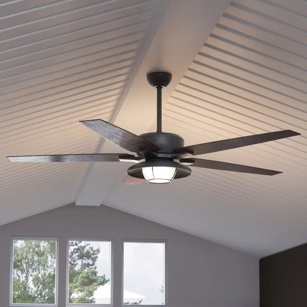 This ceiling fan called Mayfield is a real looker! Six squared off wood toned blades are held in place with matte black arms. The cool and warm tones play well together giving it a comforting aesthetic. The Integrated LED light kit provides the right amount of light for a completely functional space.