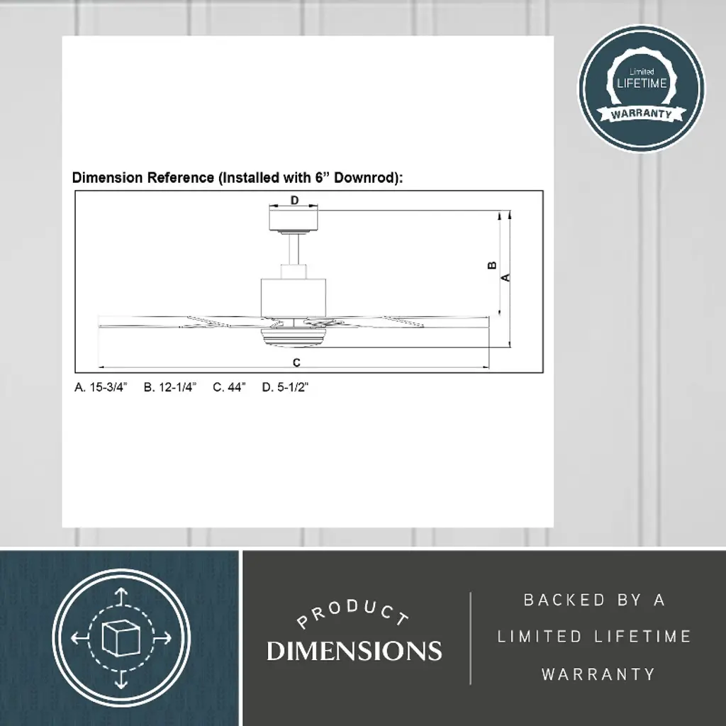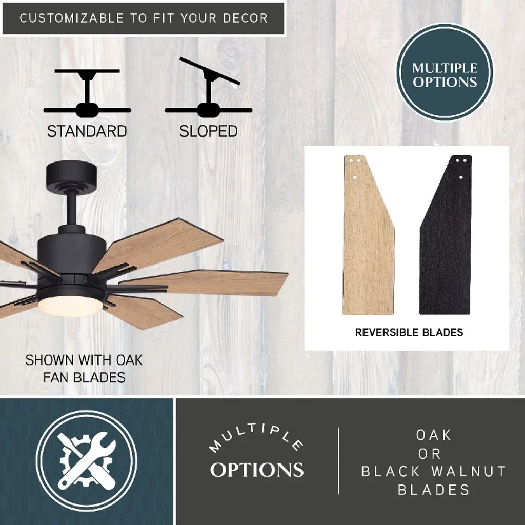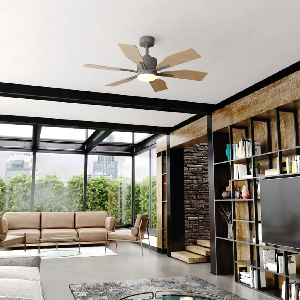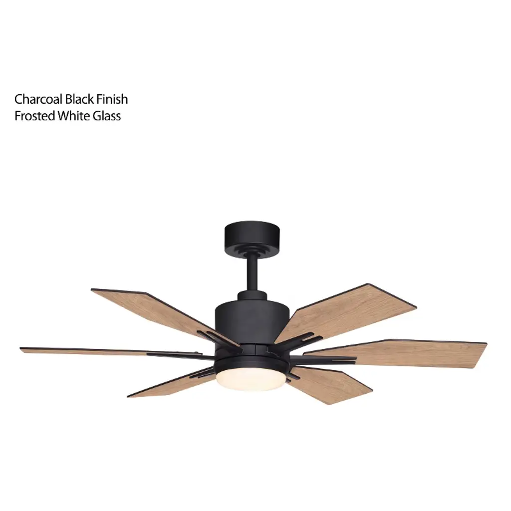 This ceiling fan called Mayfield is a real looker! Six squared off wood toned blades are held in place with matte black arms. The cool and warm tones play well together giving it a comforting aesthetic. The Integrated LED light kit provides the right amount of light for a completely functional space.