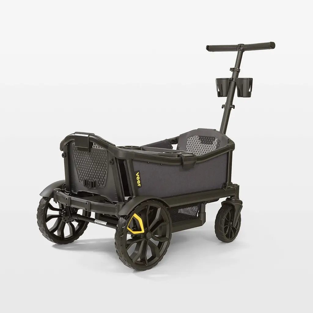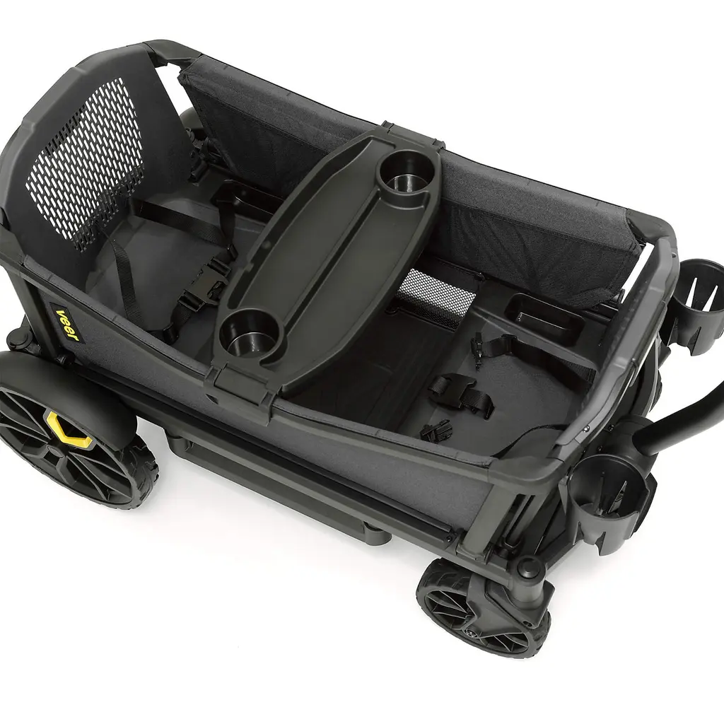 From the first months of life to big-kid soccer meets, the Veer Cruiser Baby Wagon easily navigates a family's ever-evolving needs. With the feel, functionality and safety of a premium stroller, this all-terrain wagon is lightweight yet tough enough to handle bumpy sidewalks and off-road adventures. Compact when folded, it has comfy contoured seating for two children with 3-point safety harnesses to keep them safely in place. Its durable, soft-sided walls (with built-in storage) are made of water-resistant, high-performance fabric that is rugged and resistant to staining and fading. Little ones will love the fun of the ride, while caregivers will appreciate thoughtful details such as a fast, one-handed fold and ergonomic handle on a telescopic handlebar. Make it your own with optional accessories like infant seat adapters and colorful canopies, sold separately.