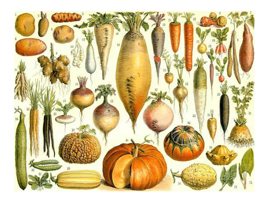 Vegetables; onion, potato, carrot, roots, tubers. Illustration from a famous French seed catalog and the vegetables that can be grown.