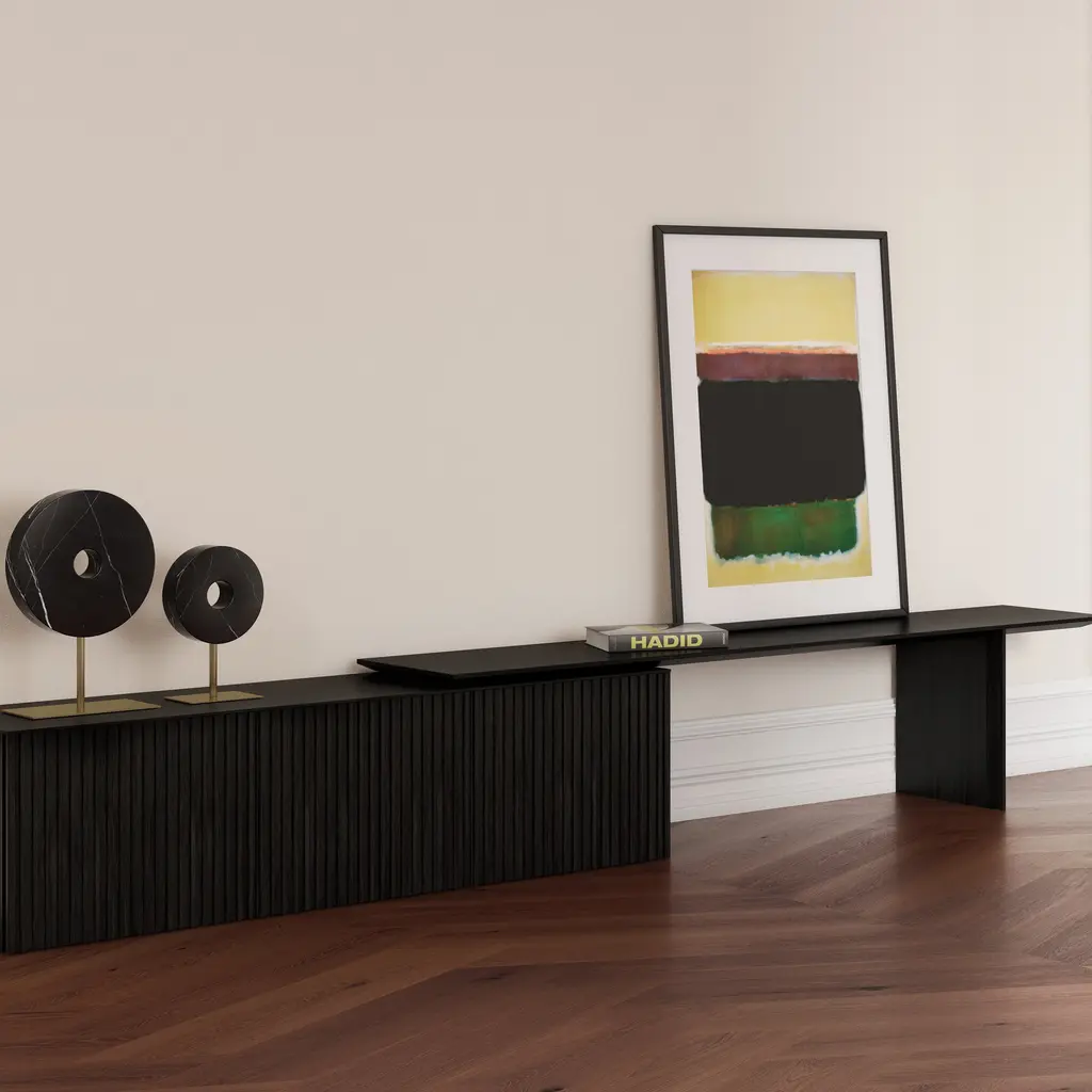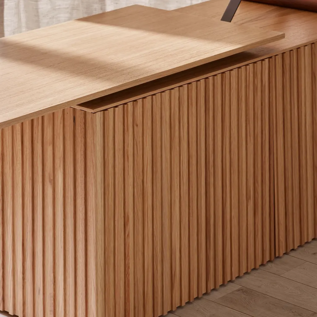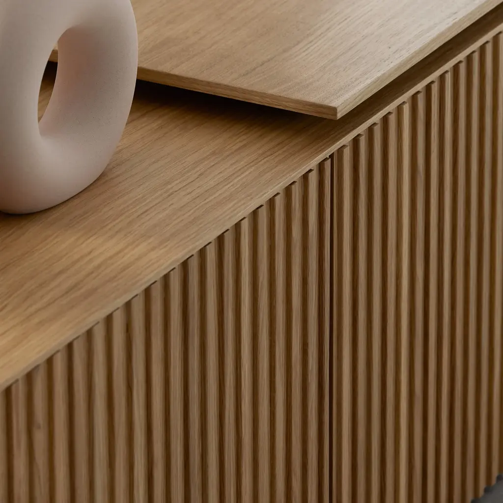 The triple-unit Composition 3 with an equal-size extendible top surface, like its siblings conceived by designers Ludovica + Roberto Palomba, lends versatility as its surface expands to suit an individual setting. Crafted in veneered oak, Velasca Extensible brings a warm approach to minimalism with the additional flourish of vertical slats on the doors and side panels.