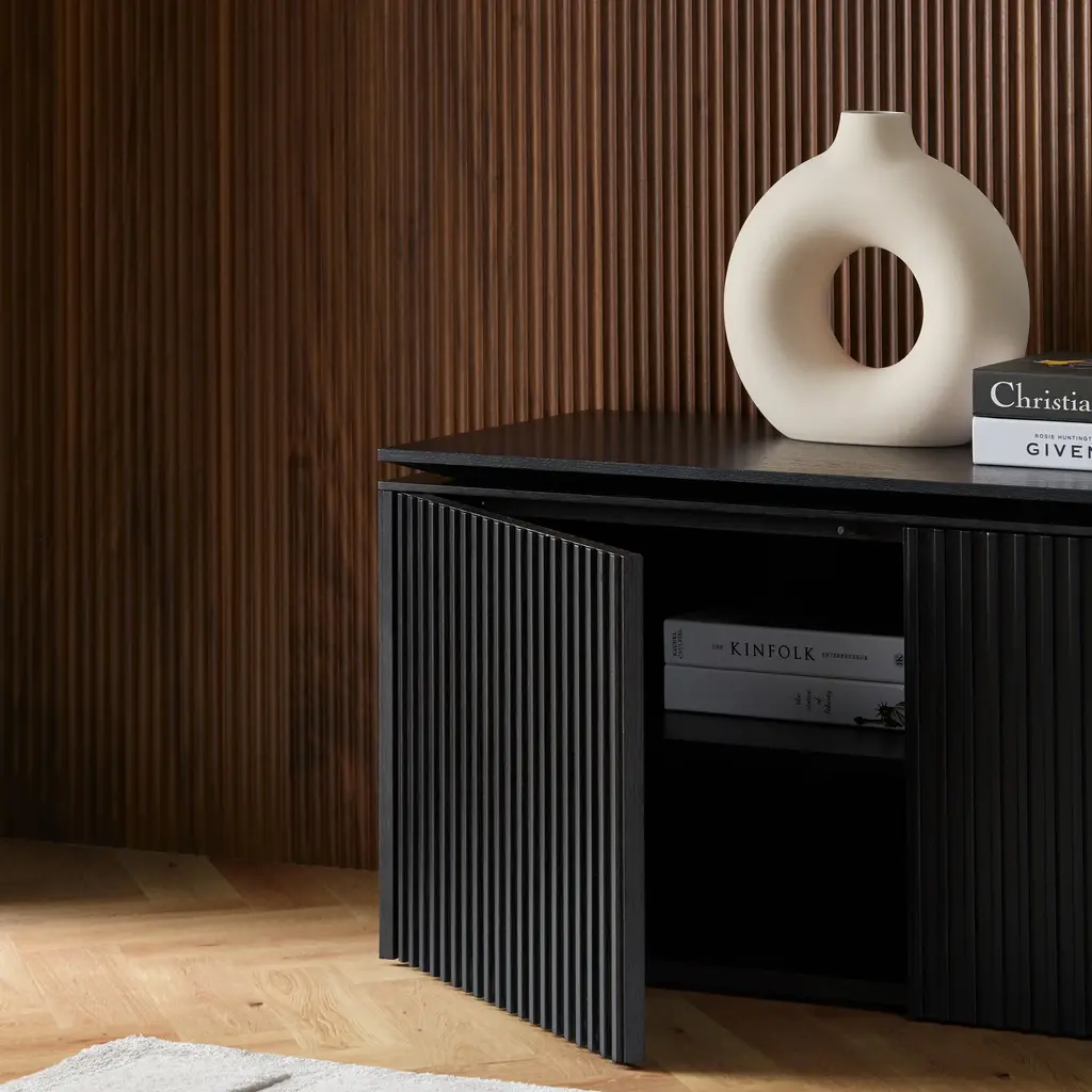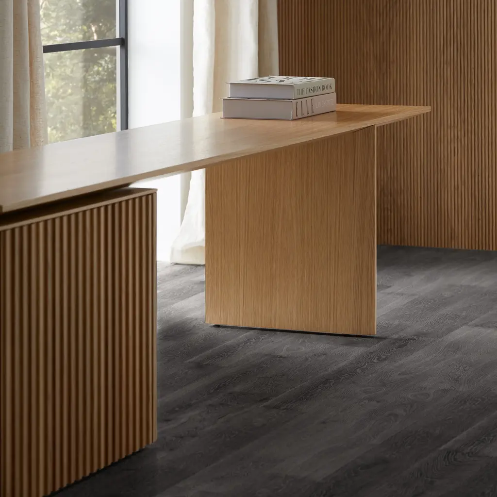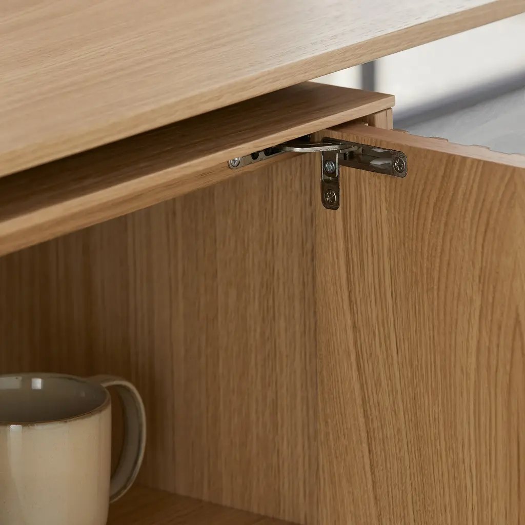 The triple-unit Composition 3 with an equal-size extendible top surface, like its siblings conceived by designers Ludovica + Roberto Palomba, lends versatility as its surface expands to suit an individual setting. Crafted in veneered oak, Velasca Extensible brings a warm approach to minimalism with the additional flourish of vertical slats on the doors and side panels.