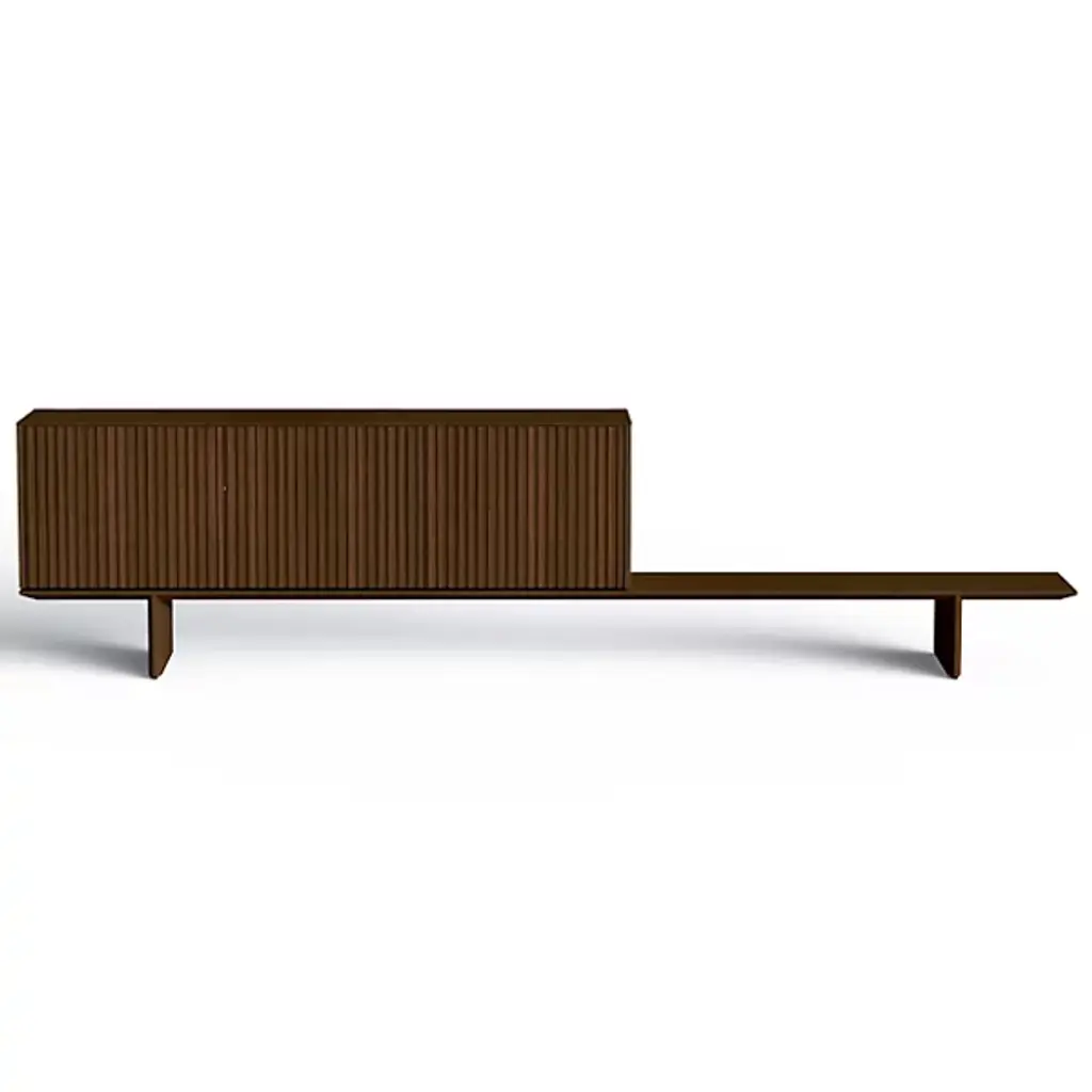 The triple-unit Composition 4 with an equal-size extendible top surface, like its siblings conceived by designers Ludovica + Roberto Palomba, lends versatility as its surface expands to suit an individual setting. Crafted in veneered oak, Velasca Extensible brings a warm approach to minimalism with the additional flourish of vertical slats on the doors and side panels.
