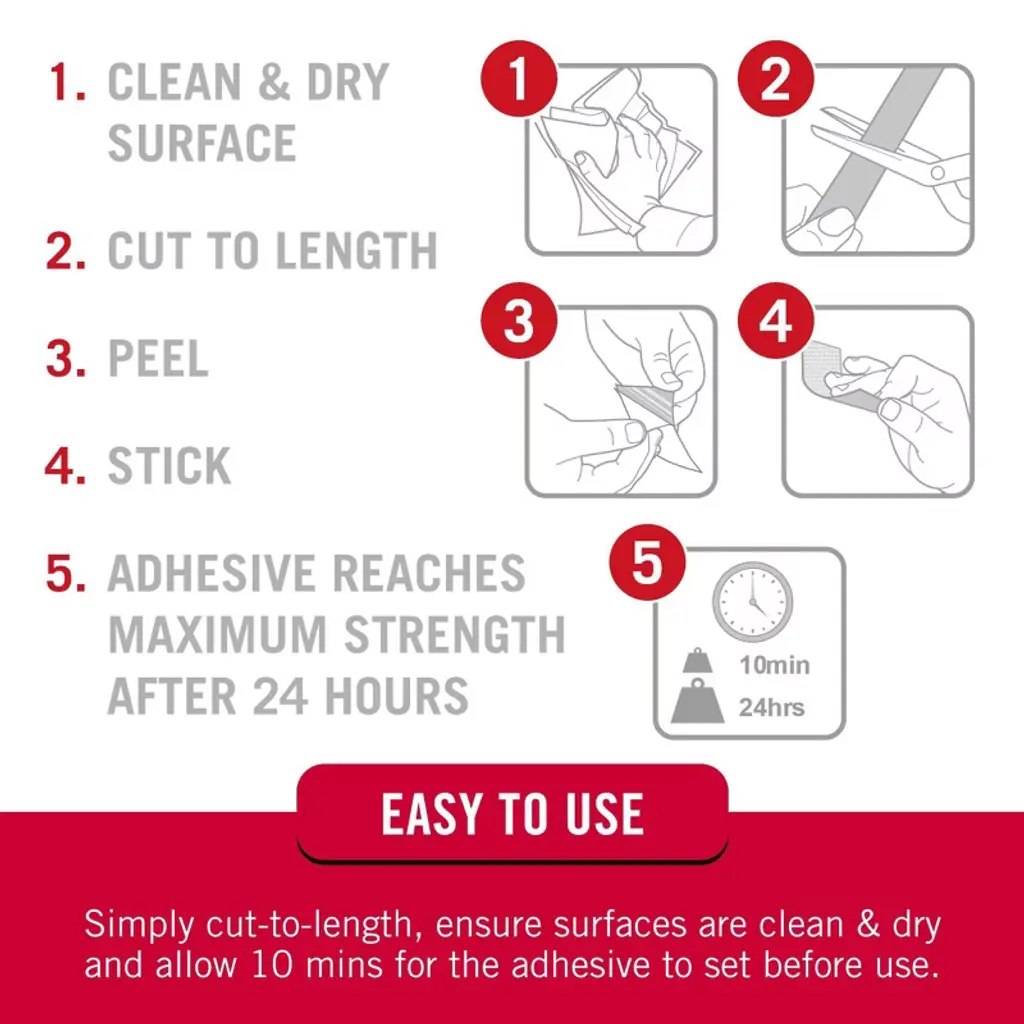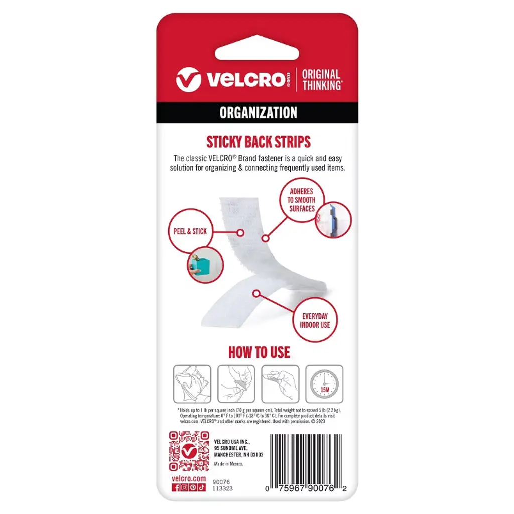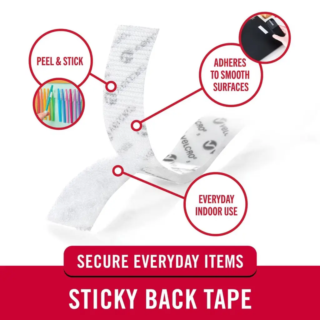 VELCRO Brand Sticky Back hook and loop fasteners deliver strong holding power. Simple peel and stick application. For smooth surfaces such as painted wallboard, glass, metal and most plastics, can be used for indoor or outdoor applications. VELCRO Brand is the original hook and loop fastener. A must have for any home, school or office. Great for organization, mounting, hanging, and securing. Instructions: 1. Clean and dry surface before application. 2. Peel tape from fastener and press firmly into place. 3. Adhesive reaches maximum strength after 24 hours. Note: Not recommended for fabrics, flexible vinyl or underwater use. Continued exposure to full sunlight can damage fastener.