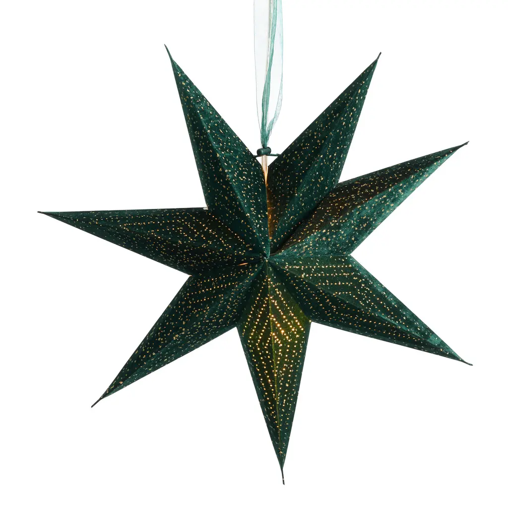 Our exclusive gold-flecked velvet and paper hanging star adds textural dimension to your holiday decor. Handmade by skilled artisans in India, this star is available in deep red or green. They are striking when displayed alone and they make a handsome complementary pair together. Easy to hang with its attached cotton ribbon, it can also be folded for easy storage.
