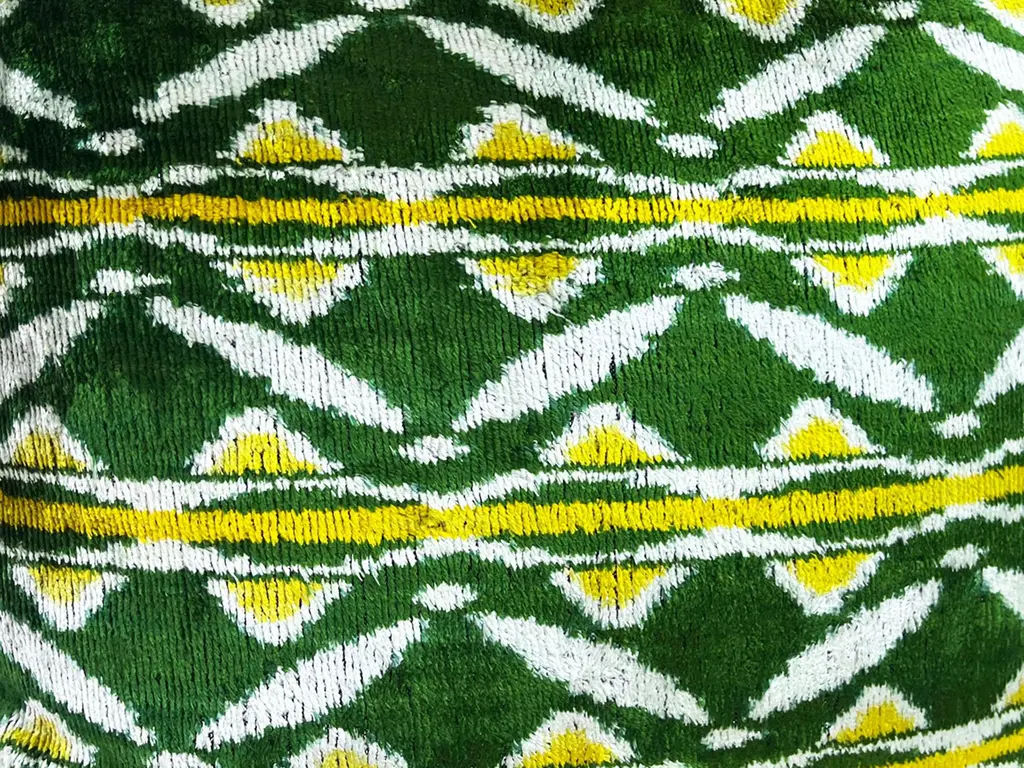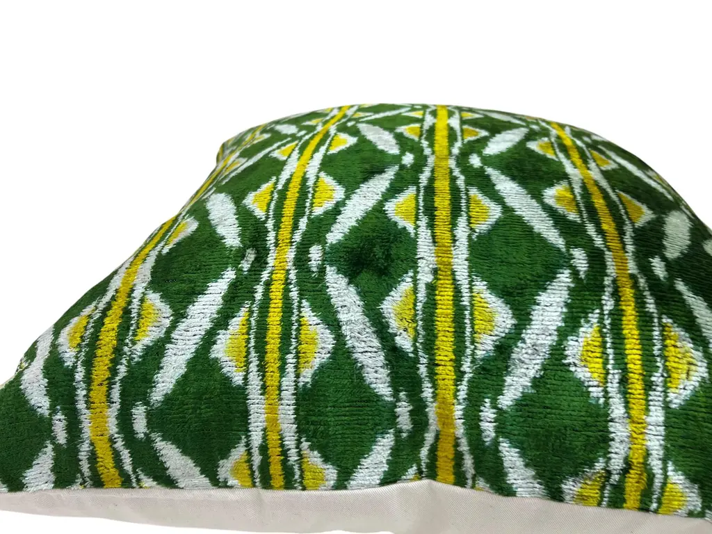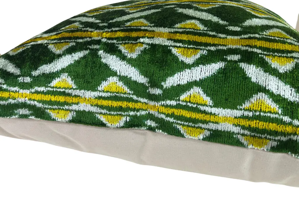 Handmade Velvet Silk IKAT cushion cover with Bohemian design and multicolor. It can be a perfect gift for new homes. This pillow case features a luxurious silk velvet fabric with an ikat pattern, adding a touch of elegance and sophistication to any space. The unique weaving technique of ikat creates a striking, artistic design, while the softness of the silk velvet ensures both comfort and visual appeal. Perfect for accenting your living room, bedroom, or any area in need of a stylish, refined statement piece. Handmade Velvet Silk IKAT cushion cover with tribal rainbow design and multicolor. It can be a perfect gift for new house. This pillow case features a luxurious silk velvet fabric with an ikat pattern, adding a touch of elegance and sophistication to any space. The unique weaving technique of ikat creates a striking, artistic design, while the softness of the silk velvet ensures both comfort and visual appeal. Perfect for accenting your living room, bedroom, or any area in need of a stylish, refined statement piece. Size: 20" 20" Inc - ( 50x50 cm ) Care: Dry Cleaning Cushion insert is not included