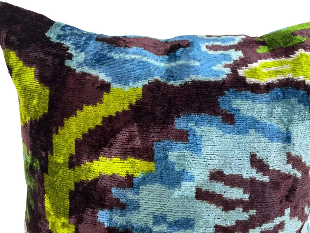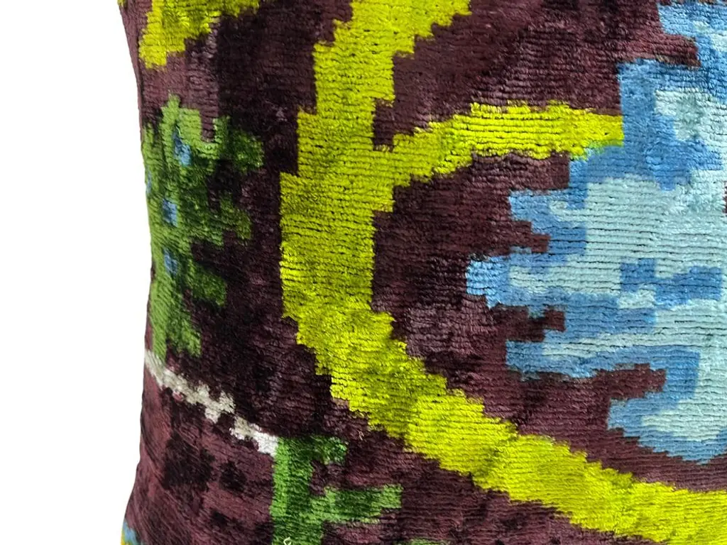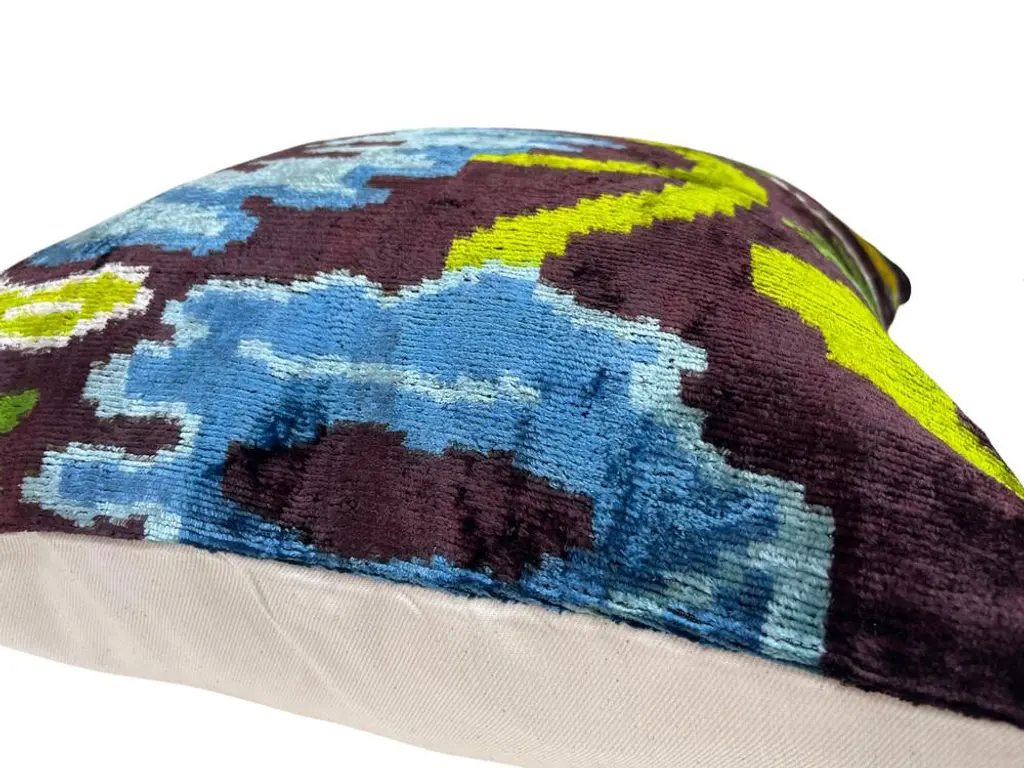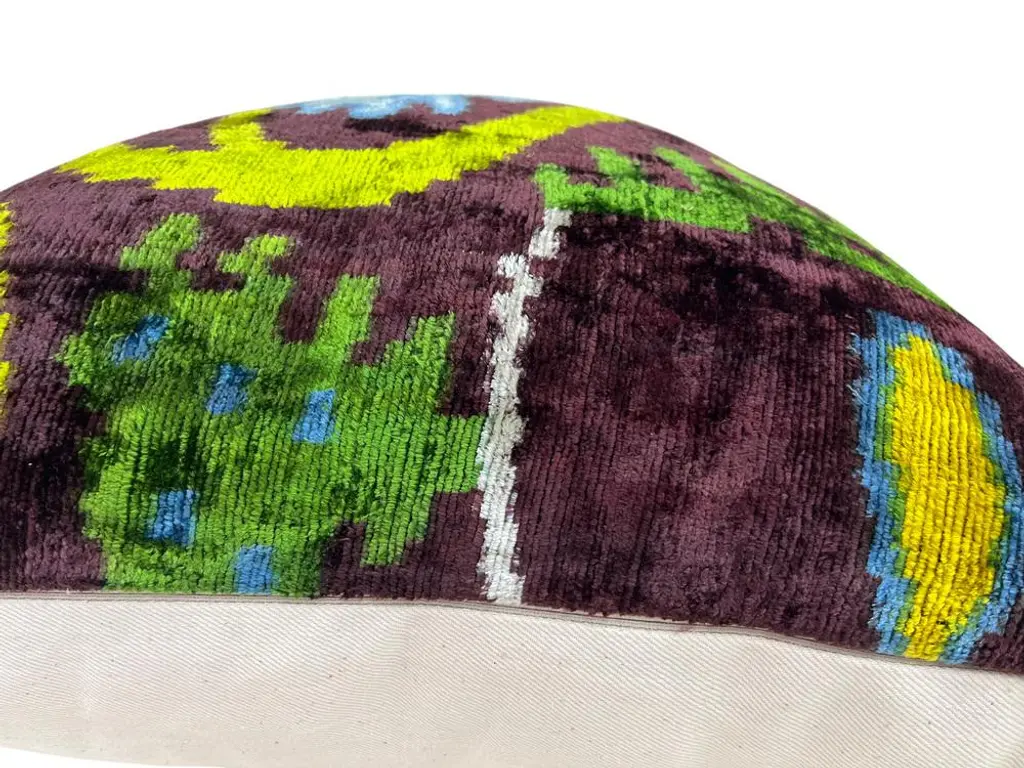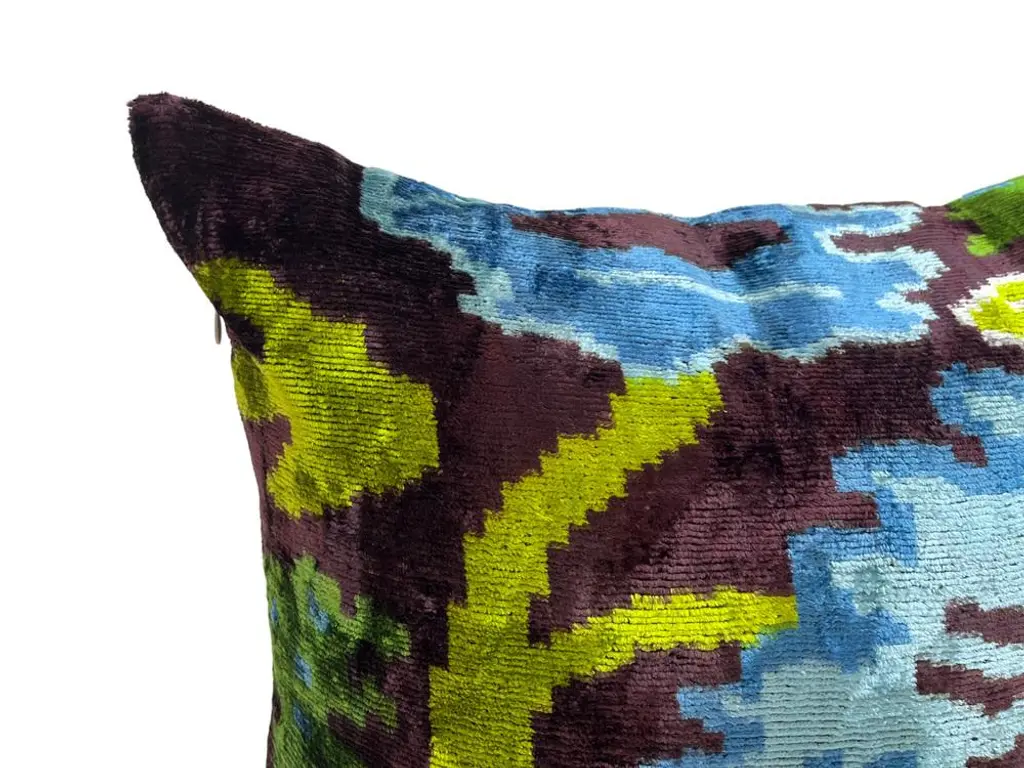 Handmade Velvet Silk IKAT cushion cover with catchy design and multicolor. It can be a perfect gift for new homes. This pillow case features a luxurious silk velvet fabric with an ikat pattern, adding a touch of elegance and sophistication to any space. The unique weaving technique of ikat creates a striking, artistic design, while the softness of the silk velvet ensures both comfort and visual appeal. Perfect for accenting your living room, bedroom, or any area in need of a stylish, refined statement piece. Handmade Velvet Silk IKAT cushion cover with tribal rainbow design and multicolor. It can be a perfect gift for new house. This pillow case features a luxurious silk velvet fabric with an ikat pattern, adding a touch of elegance and sophistication to any space. The unique weaving technique of ikat creates a striking, artistic design, while the softness of the silk velvet ensures both comfort and visual appeal. Perfect for accenting your living room, bedroom, or any area in need of a stylish, refined statement piece. Size: 20" 20" Inc - ( 50x50 cm ) Care: Dry Cleaning Cushion insert is not included
