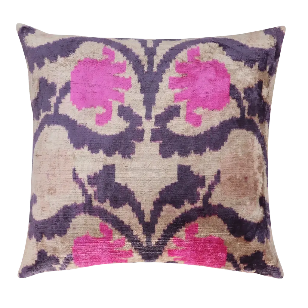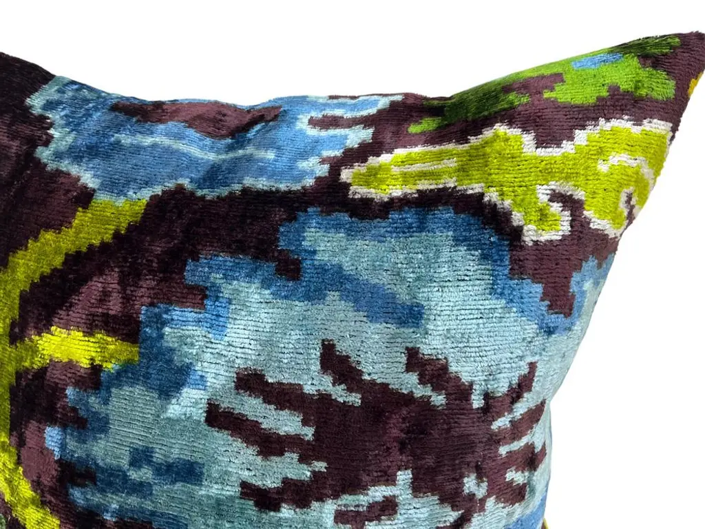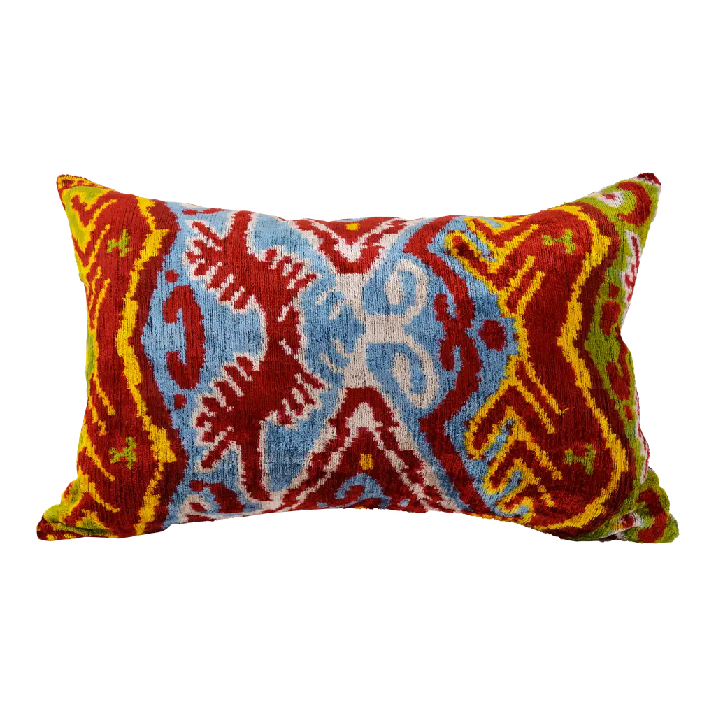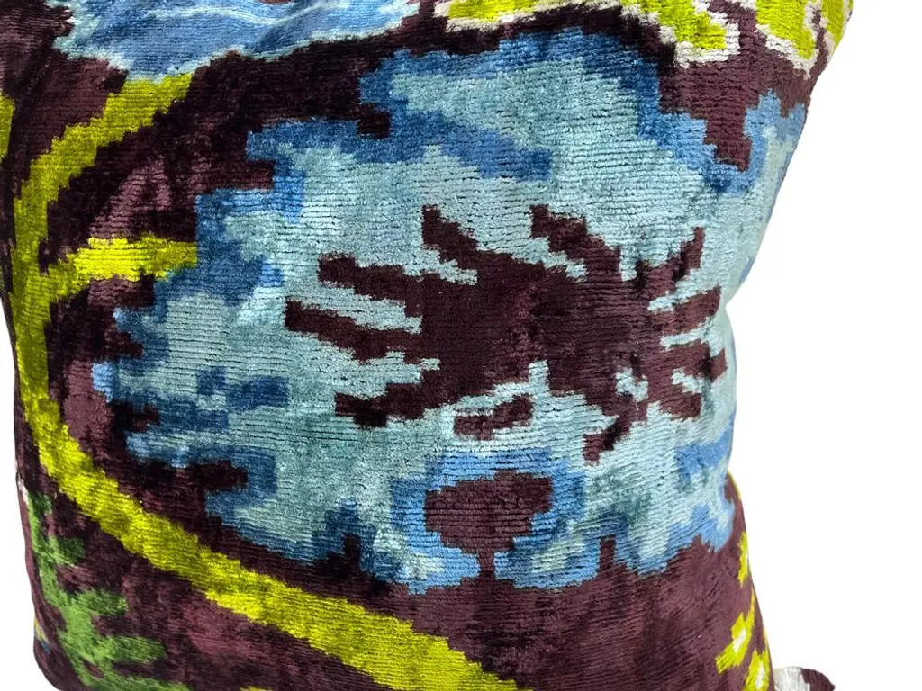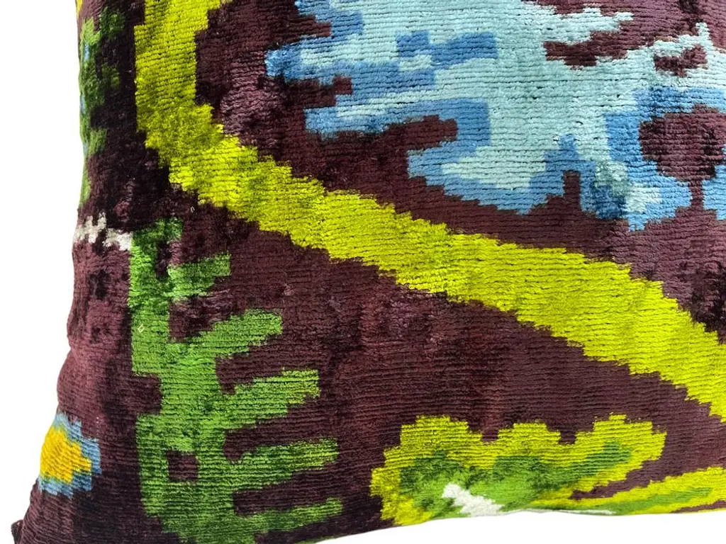 Handmade Velvet Silk IKAT cushion cover with catchy design and multicolor. It can be a perfect gift for new homes. This pillow case features a luxurious silk velvet fabric with an ikat pattern, adding a touch of elegance and sophistication to any space. The unique weaving technique of ikat creates a striking, artistic design, while the softness of the silk velvet ensures both comfort and visual appeal. Perfect for accenting your living room, bedroom, or any area in need of a stylish, refined statement piece. Handmade Velvet Silk IKAT cushion cover with tribal rainbow design and multicolor. It can be a perfect gift for new house. This pillow case features a luxurious silk velvet fabric with an ikat pattern, adding a touch of elegance and sophistication to any space. The unique weaving technique of ikat creates a striking, artistic design, while the softness of the silk velvet ensures both comfort and visual appeal. Perfect for accenting your living room, bedroom, or any area in need of a stylish, refined statement piece. Size: 20" 20" Inc - ( 50x50 cm ) Care: Dry Cleaning Cushion insert is not included