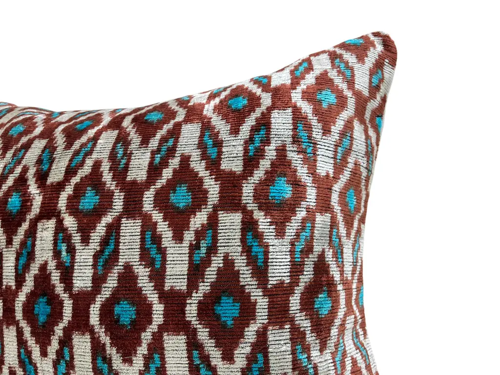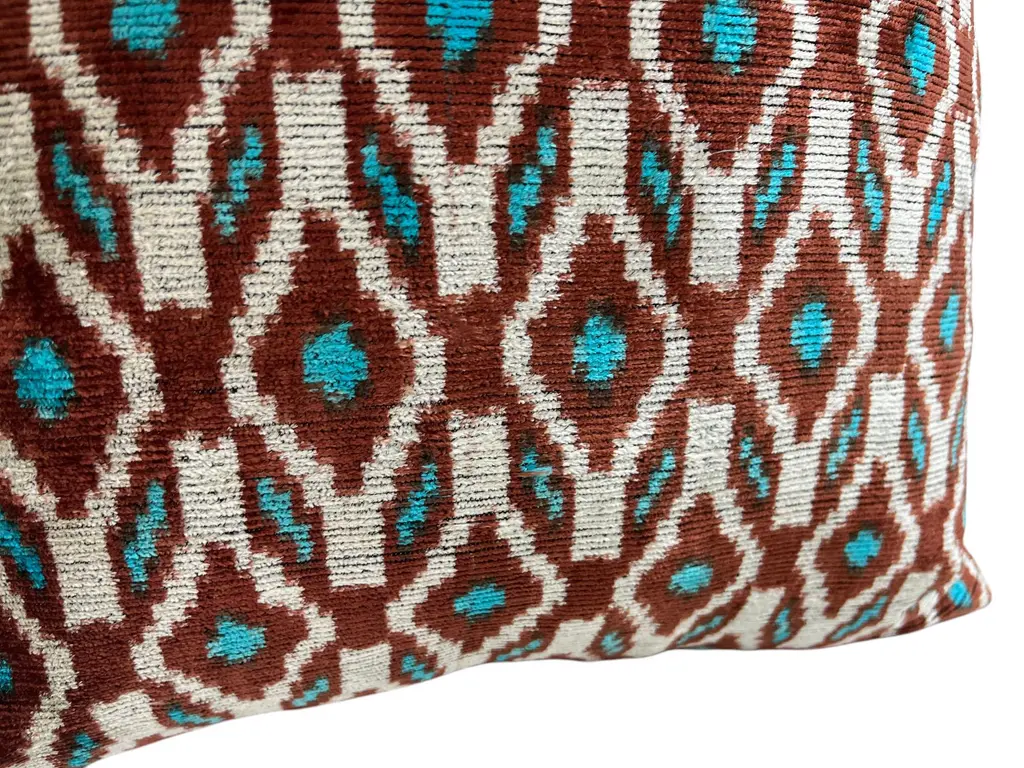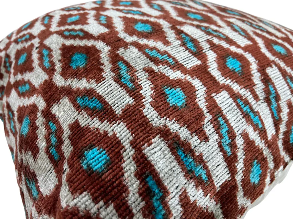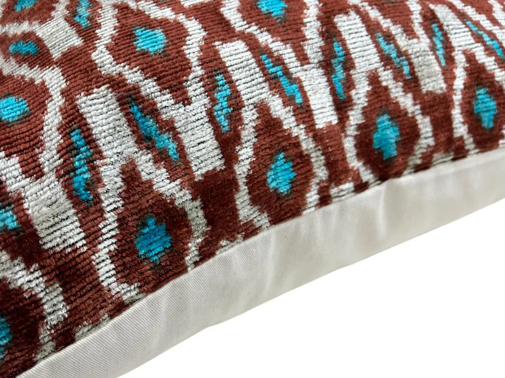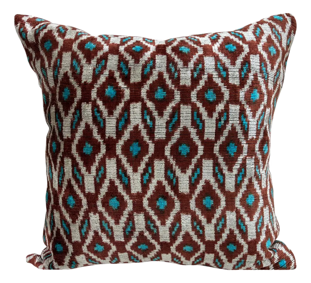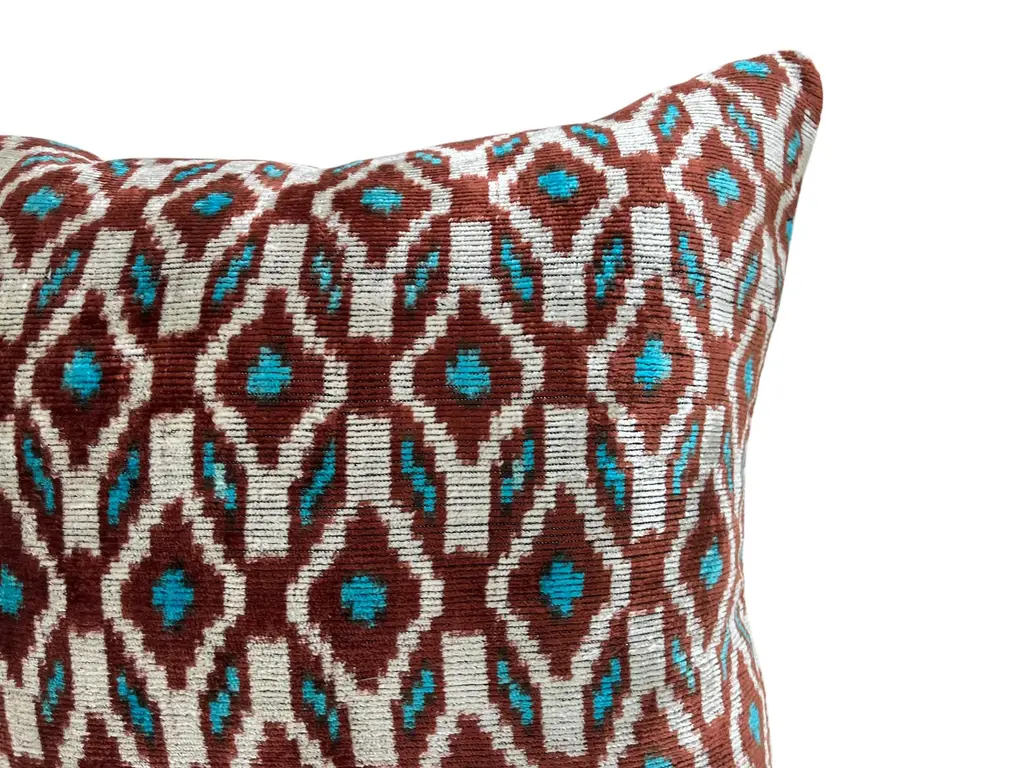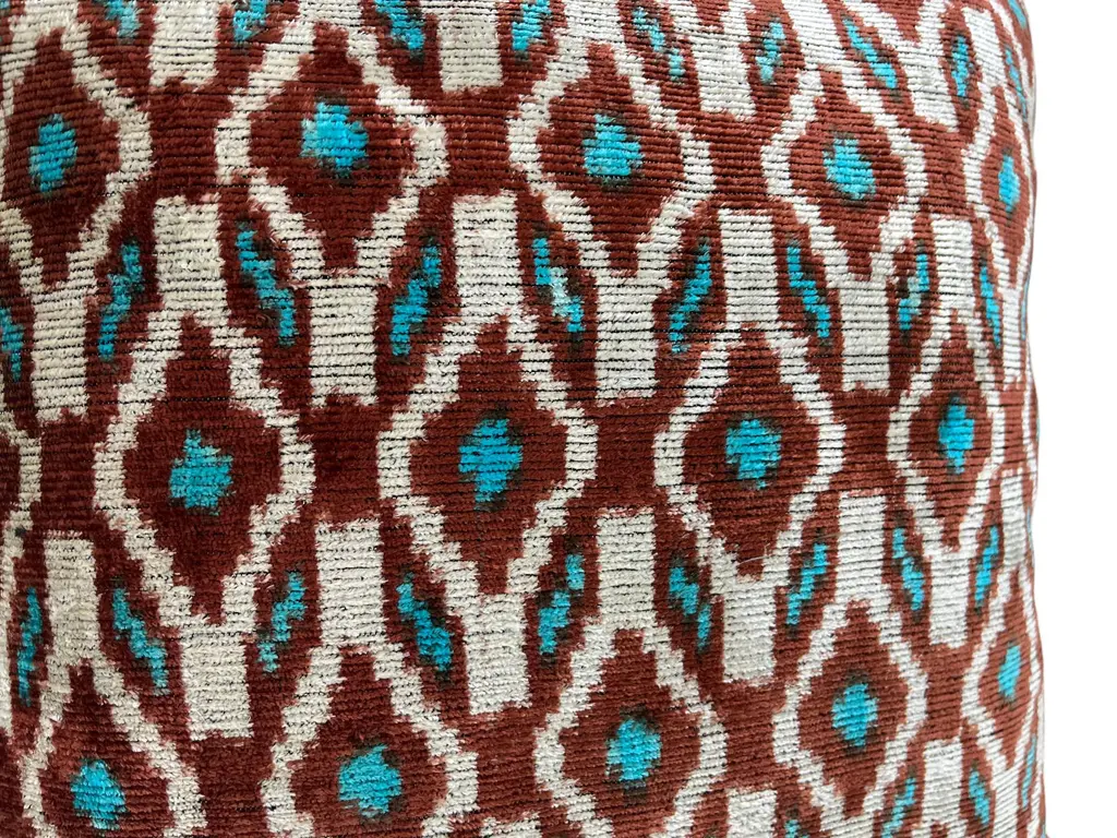 Handmade Velvet Silk IKAT cushion cover with tribal ethnic design and multicolor. It can be a perfect gift for new homes. This pillow case features a luxurious silk velvet fabric with an ikat pattern, adding a touch of elegance and sophistication to any space. The unique weaving technique of ikat creates a striking, artistic design, while the softness of the silk velvet ensures both comfort and visual appeal. Perfect for accenting your living room, bedroom, or any area in need of a stylish, refined statement piece. Size: 20" 20" Inc - (50x50 cm) Care: Dry Cleaning Cushion insert is not included