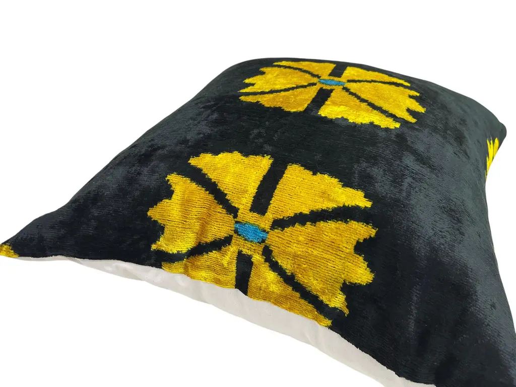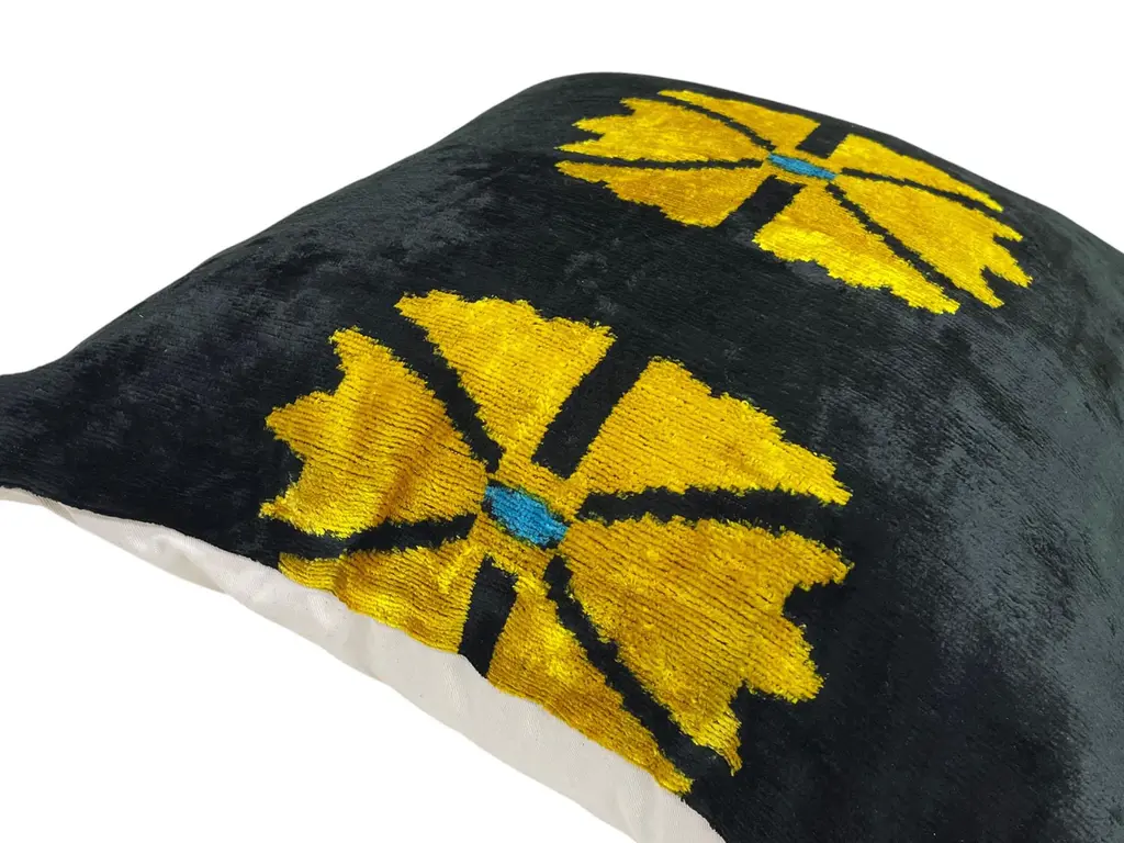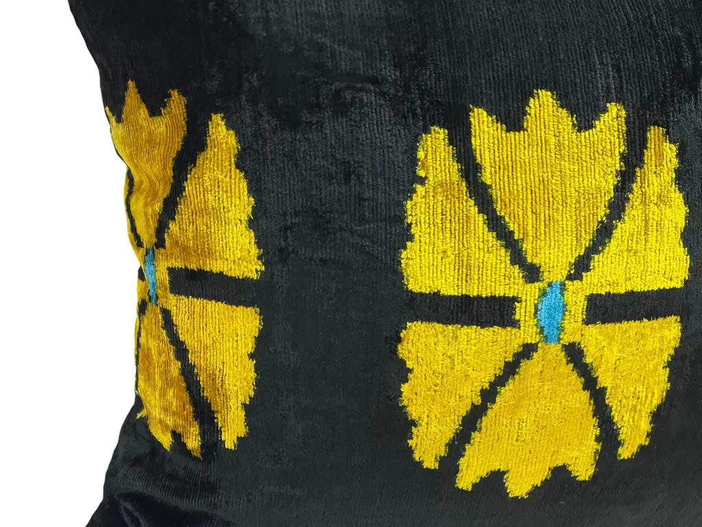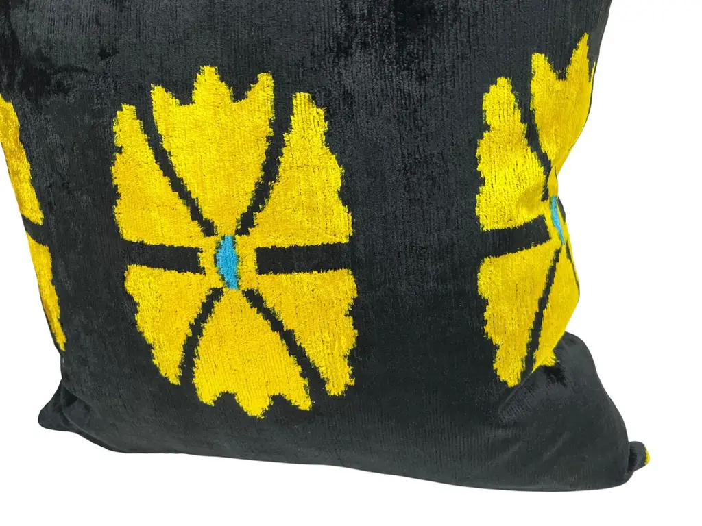 Handmade Velvet Silk IKAT cushion cover with flower design and multicolor. It can be a perfect gift for new homes. This pillow case features a luxurious silk velvet fabric with an ikat pattern, adding a touch of elegance and sophistication to any space. The unique weaving technique of ikat creates a striking, artistic design, while the softness of the silk velvet ensures both comfort and visual appeal. Perfect for accenting your living room, bedroom, or any area in need of a stylish, refined statement piece. Handmade Velvet Silk IKAT cushion cover with tribal rainbow design and multicolor. It can be a perfect gift for new house. This pillow case features a luxurious silk velvet fabric with an ikat pattern, adding a touch of elegance and sophistication to any space. The unique weaving technique of ikat creates a striking, artistic design, while the softness of the silk velvet ensures both comfort and visual appeal. Perfect for accenting your living room, bedroom, or any area in need of a stylish, refined statement piece. Size: 20" 20" Inc - ( 50x50 cm ) Care: Dry Cleaning Cushion insert is not included