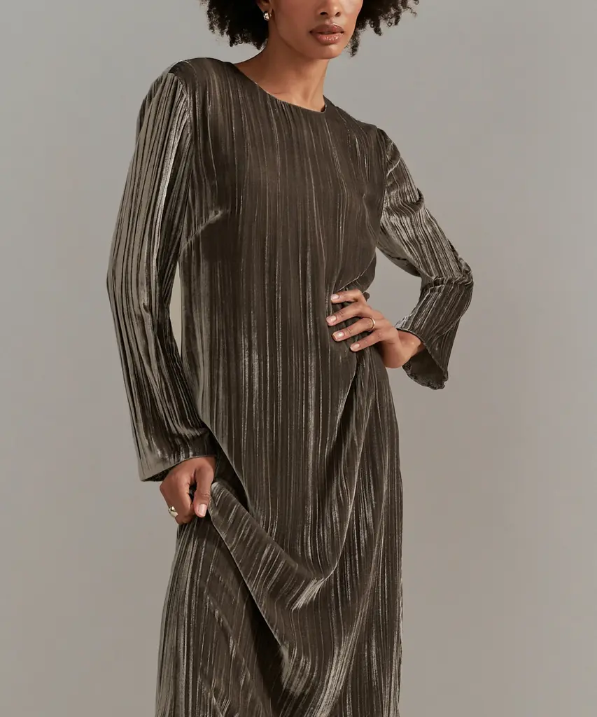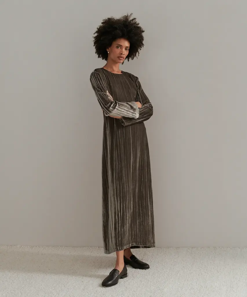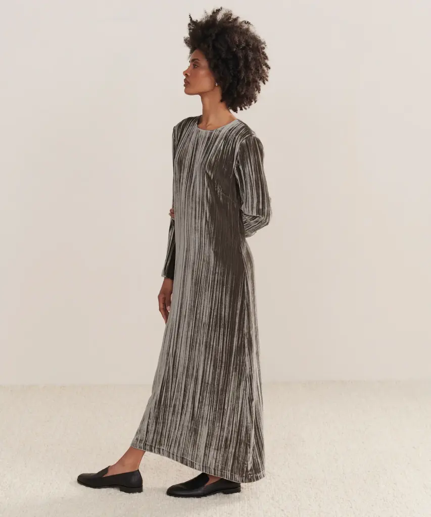 Velvet Stella Dress Flint Reinvigorate your seasonal wardrobe with a limited-edition fabric: crushed velvet. In what might be our new favorite neutral, the Velvet Stella Dress in Flint brings a flair of refinement to any holiday look. Wear this to any sort of festivity in the month ahead, pairing it with one of our coats and a kitten heel for the perfect take on the season.