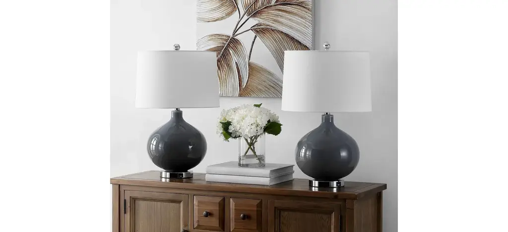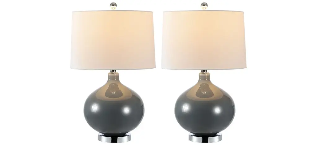 Elegant and contemporary, this Vemeli Table Lamp is a must-have for today's d_cor. Vemeli is absolutely lovely in the sleek grey glass of its classic gourd silhouette, while its silver metal base proves especially fabulous with a built-in USB port. Sold in sets of two.