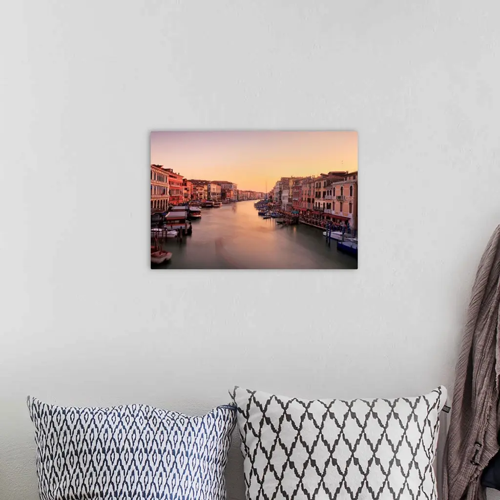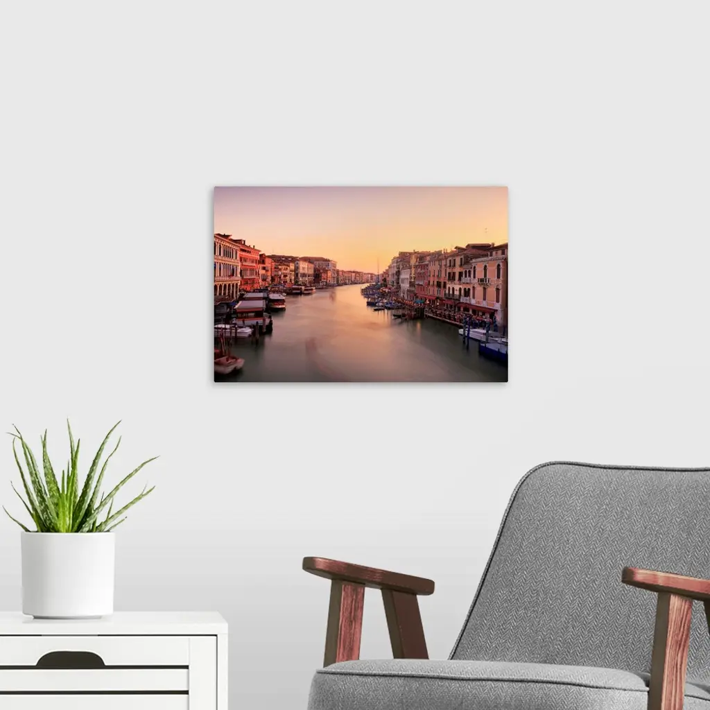 Venetian canal side palaces around Rialto Bridge glow in last of evening light. wall art for home and office decor. Discover canvas art prints, photos, mural, big canvas art and framed wall art in GreatBigCanvas.com's varied collections.