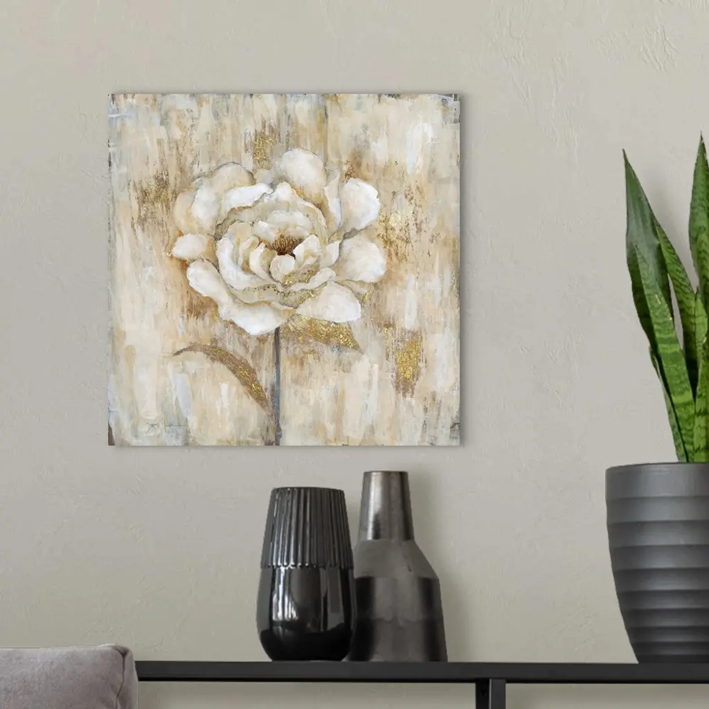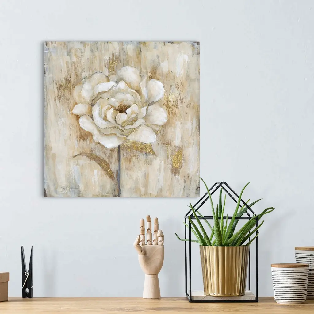 Elegant square decor with a painted white flower in the center and metallic gold markings all around.
