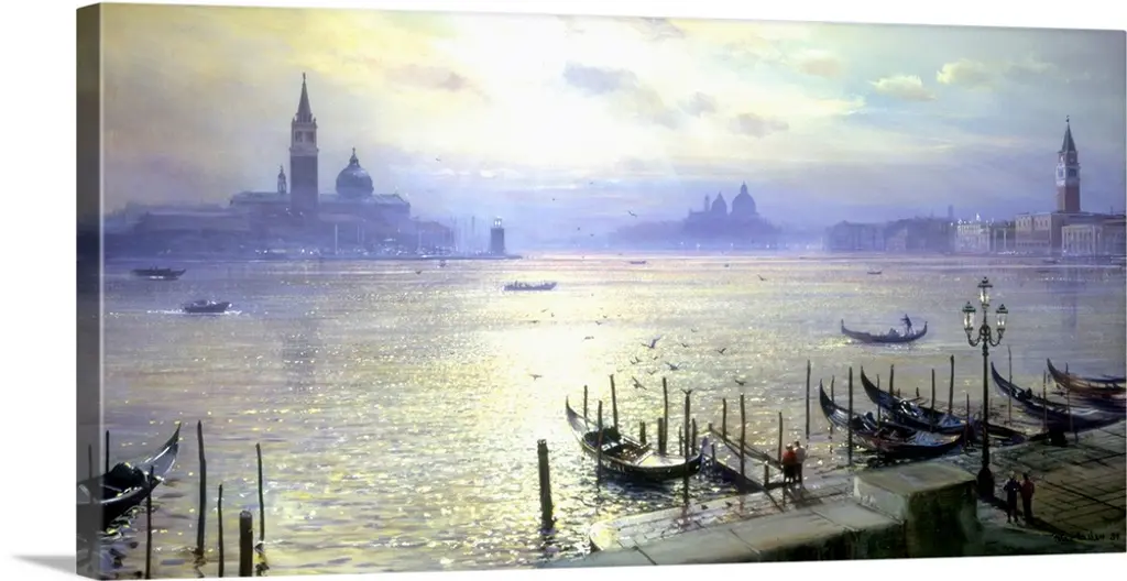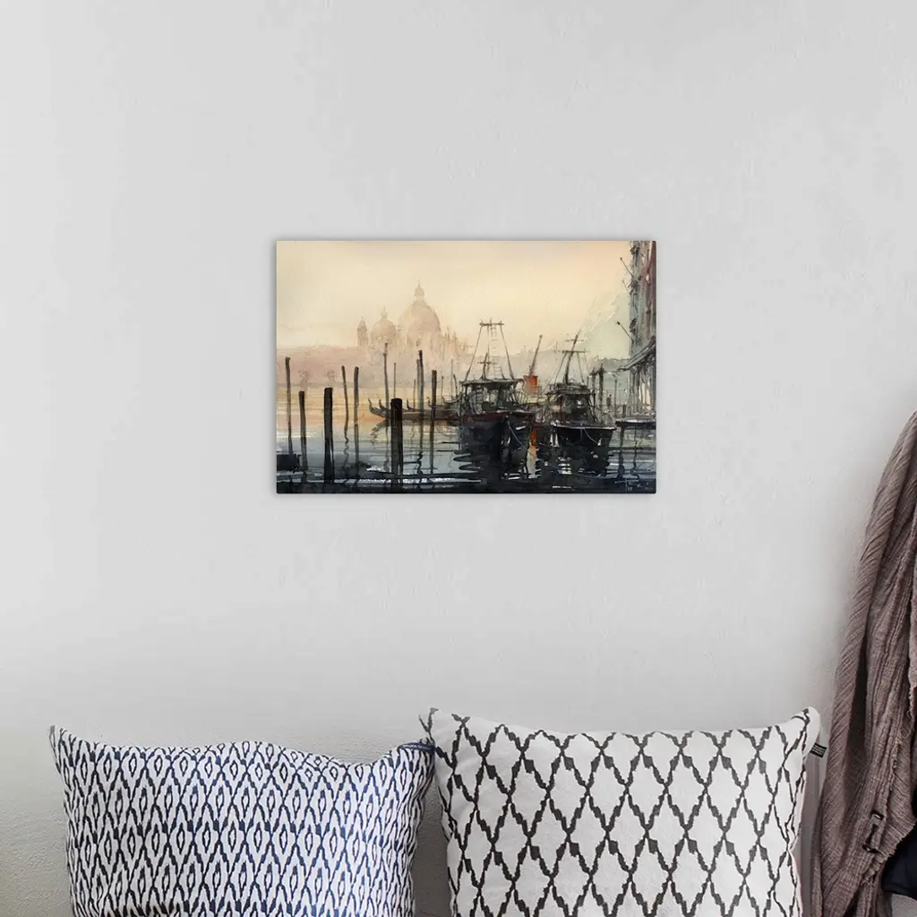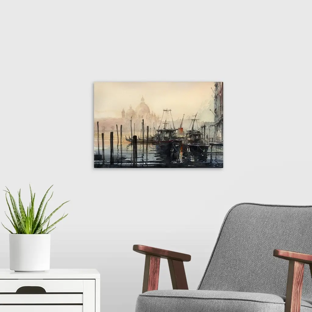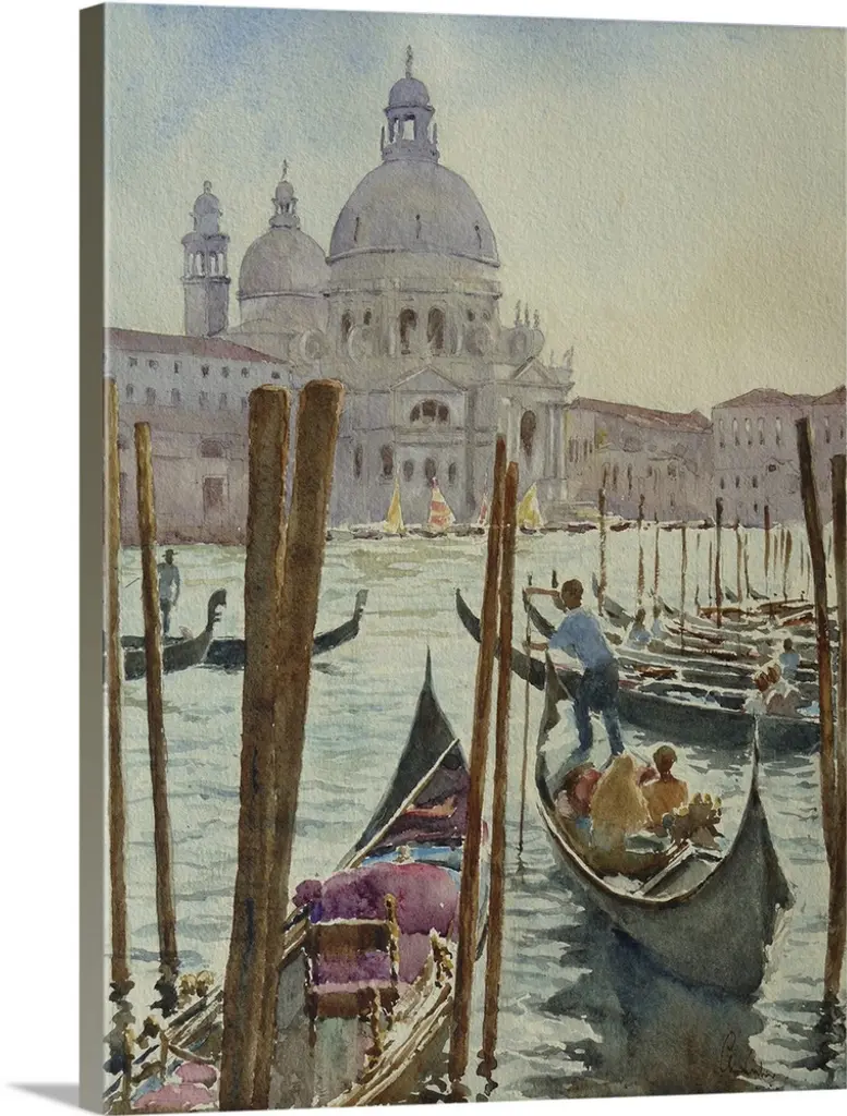 Heavy shadows and reflective water create boats in Venice with the Santa Maria della Salute Cathedral in the background.