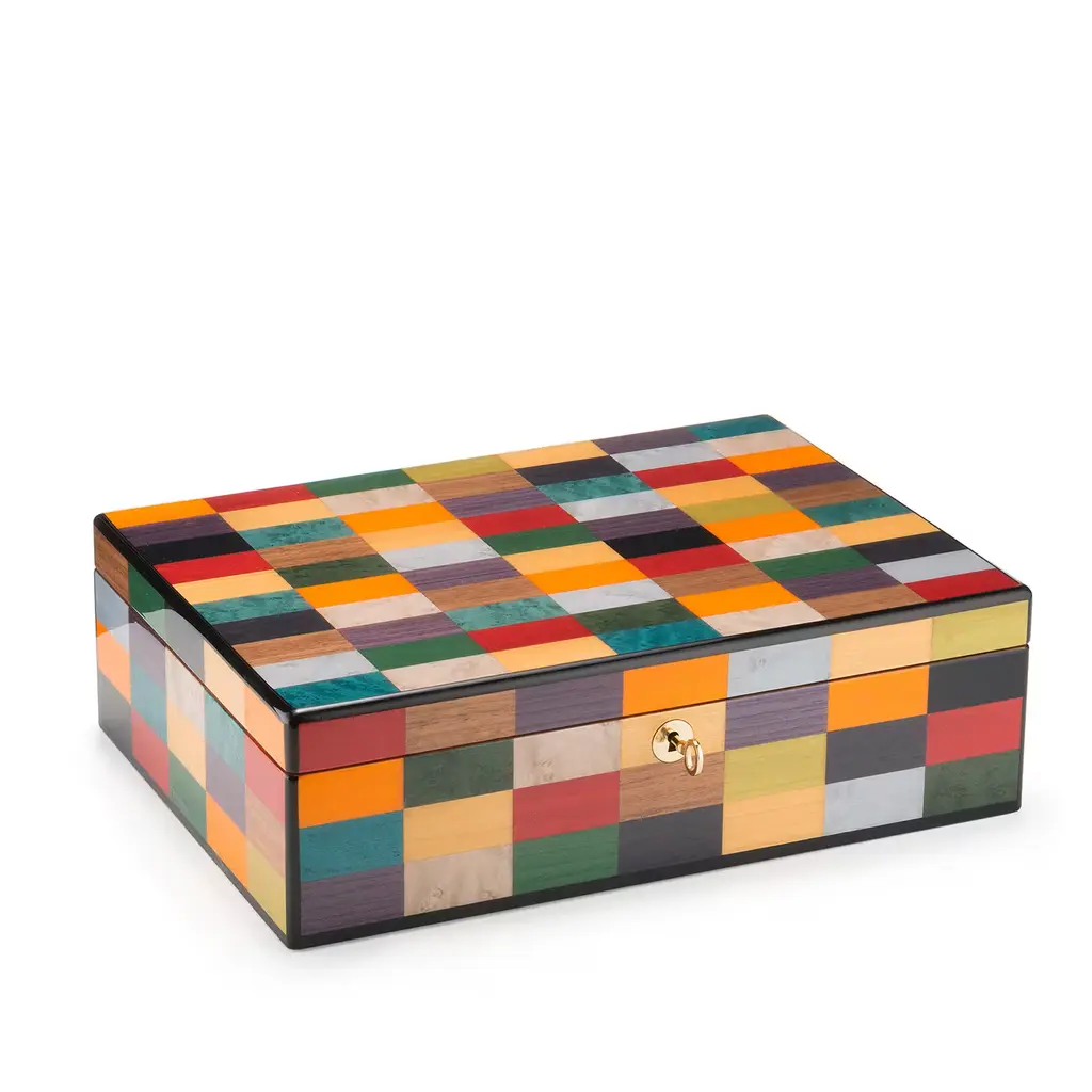 Characterized by a masterfully handcrafted silhouette, this superb watch case combines mahogany wood, gold-finished metal, and beige Alcantara lining in a refined design. Lined and featuring 10 watch holders, it boasts a stunning inlaid work covering its whole wooden surface composed of colorful rectangles.
