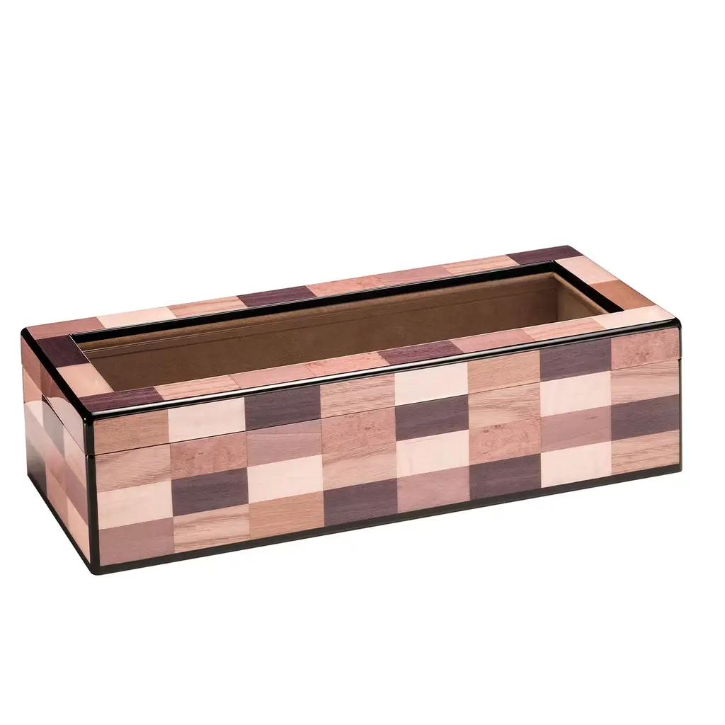 A masterful showcase of craftsmanship, this exquisite watch will be the perfect gift for watch and design aficionados. Storing up to six watches, its interior is lined with beige alcantara and enriched with an elegant mirror placed on the top. Showcasing a rectangular silhouette enriched with elegant rose gold-finished metal details, it is fashioned of mahogany veneered with a geometric inlay work in a delicate pastel palette.