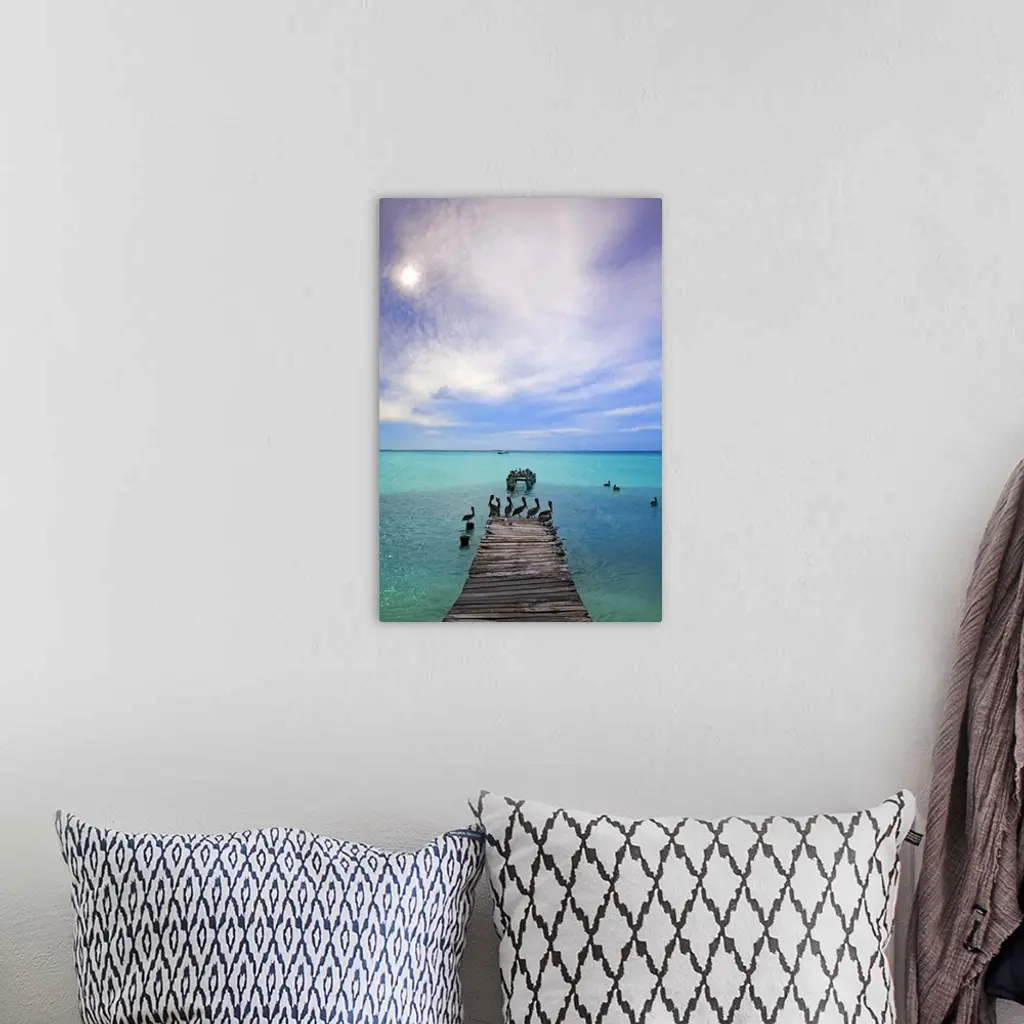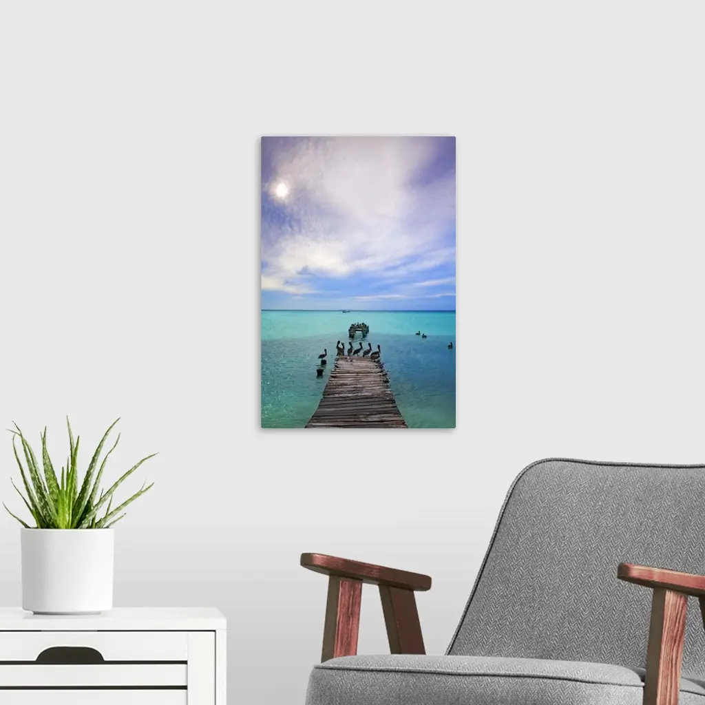 Venezuela, Archipelago Los Roques National Park, Madrisque Island, Pelicans On Pier