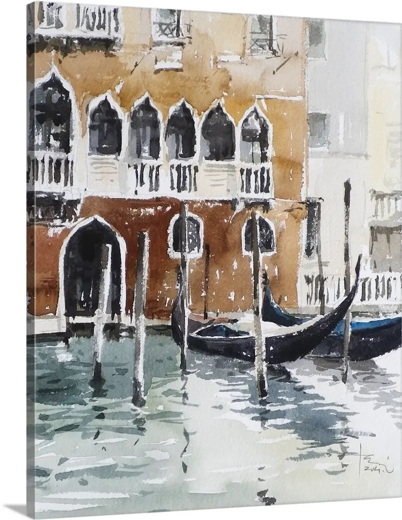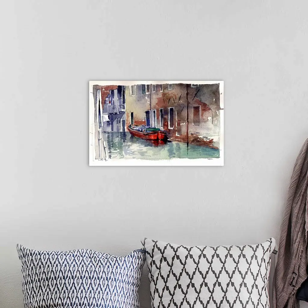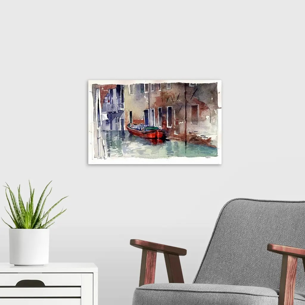 A hidden red barge in an offshoot waterway illustrates the warmth of everyday life in Venice, Italy.