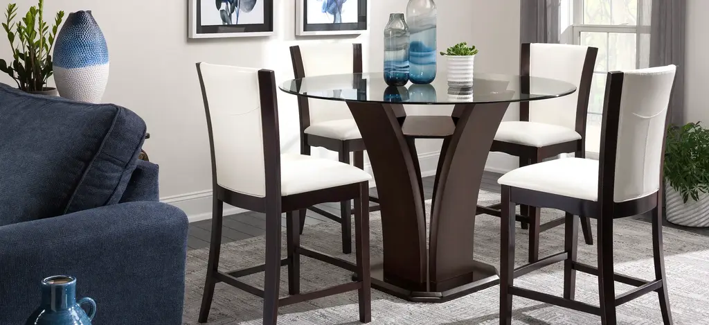 This Venice 54" glass counter-height dining table combines the small-scale coziness of casual dining with a more formal feel. It features an elegant tulip base and a beveled glass tabletop that provides an open, airy feel. Plus, the beautiful merlot finish will add warmth to your dining room or eat-in kitchen.