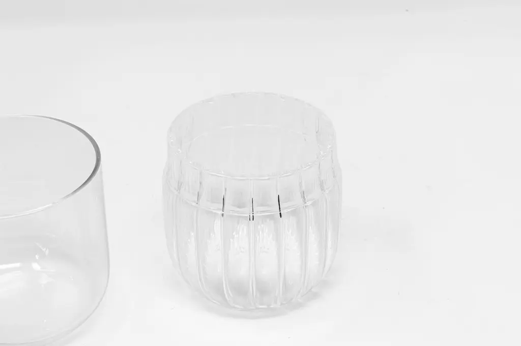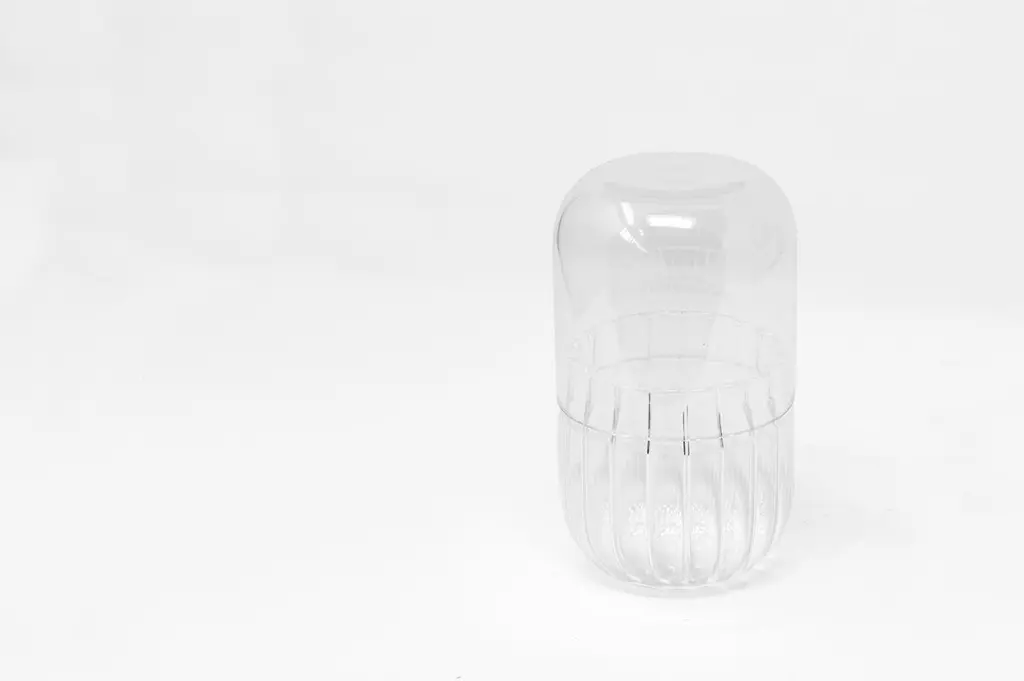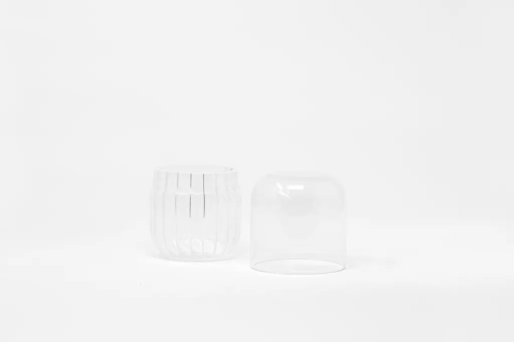 Innesti S is a container in borosilicate glass masterfully blown in Venice by Soffieria for Hands on Design. Designed by GumDesign this piece is characterized by the contrast between striped glass of the bottom and the smooth finish of the top; this element, combined to the simple shape, makes this container beautiful even when it's empty and suitable for many spots of the house. The Innesti collection, which includes a large container and a vase for a single flower, is also really functional and dishwasher safe.