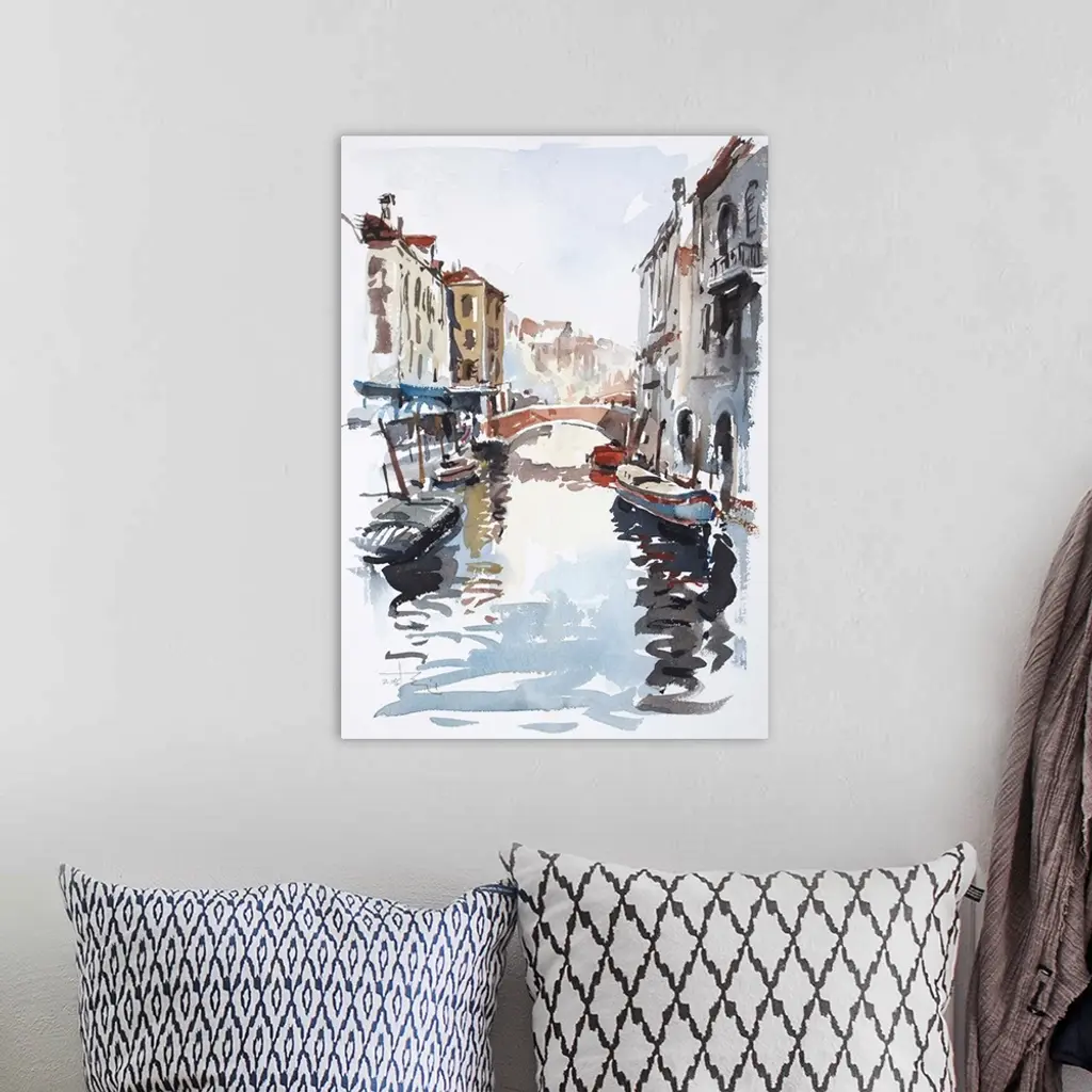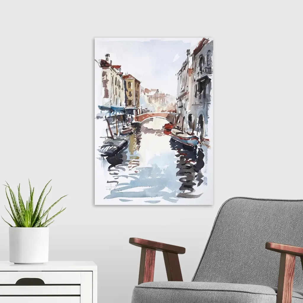 Gestural brush strokes of saturated watercolors illustrate one of the water-traffic corridors in Venice.