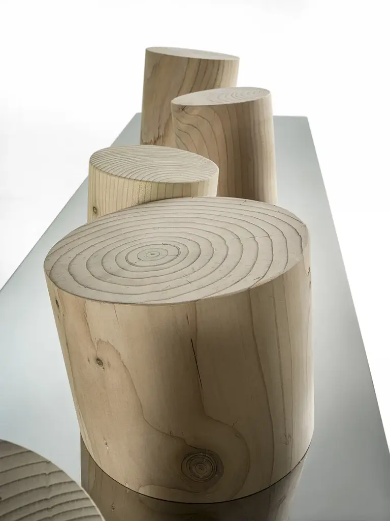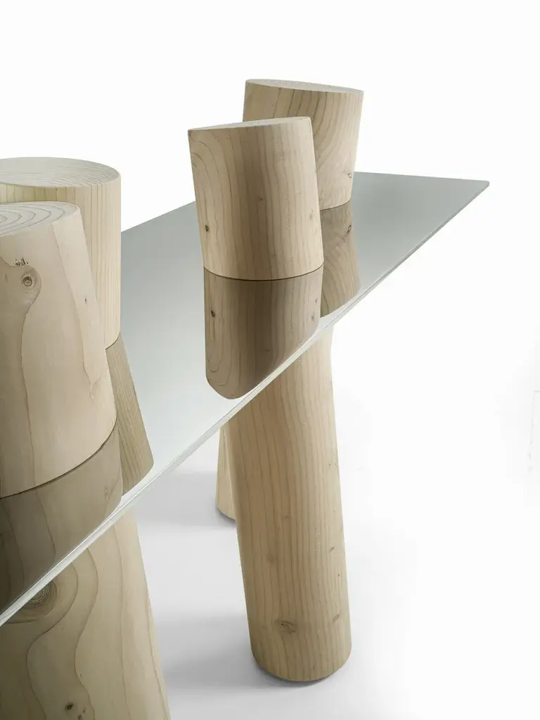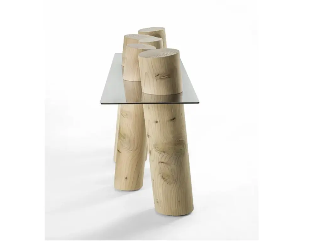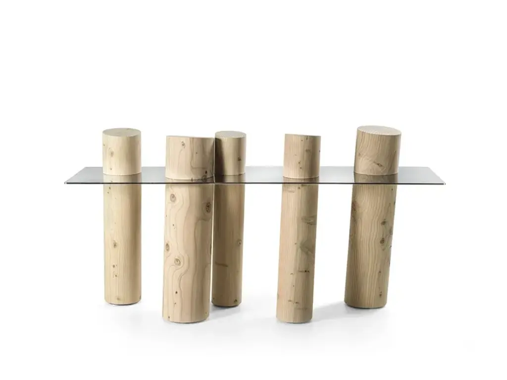 Venice is a console with polished steel top (also available in extra clear glass and smoked glass “stopsol”) combined with a series of posts made of solid cedar wood.