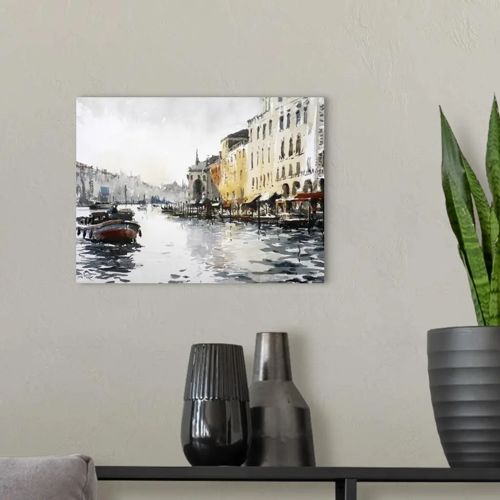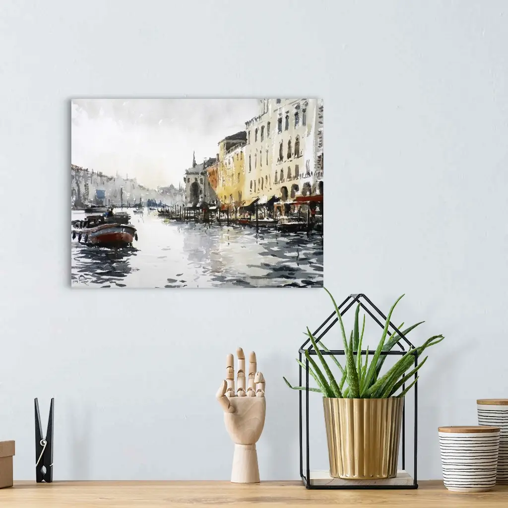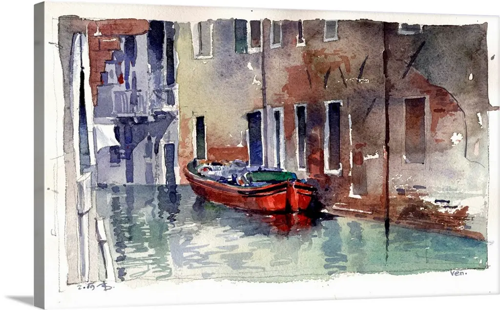 Soft watercolor brush strokes with pops of dark red create a water landscape of one of the major water-traffic corridors in Venice.
