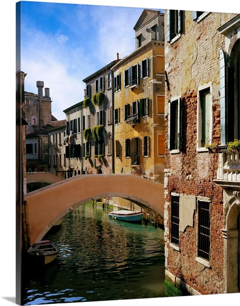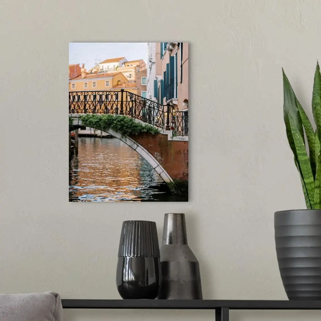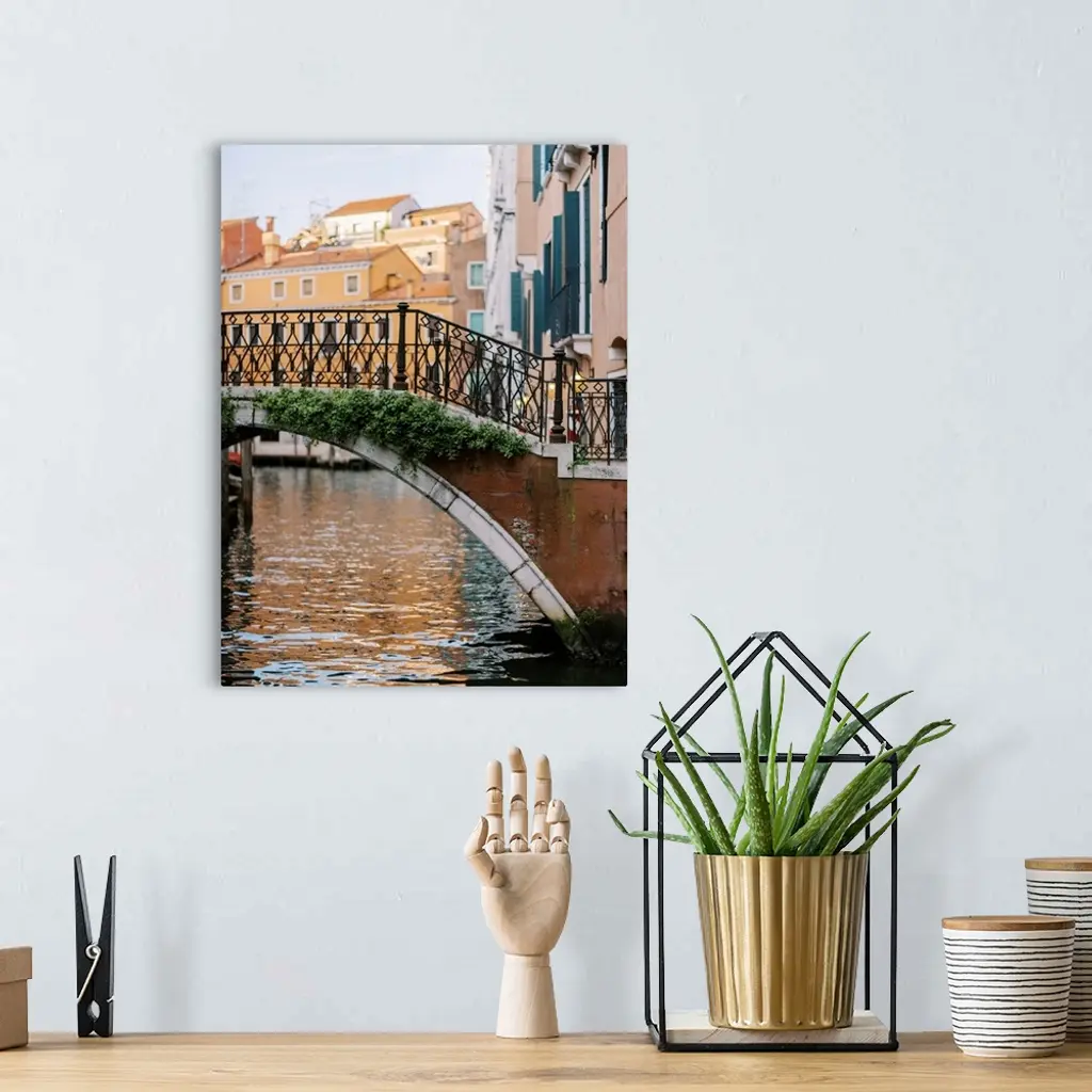 A photograph of a beautiful wrought iron and stone bridge crossing a canal in Venice, Italy.