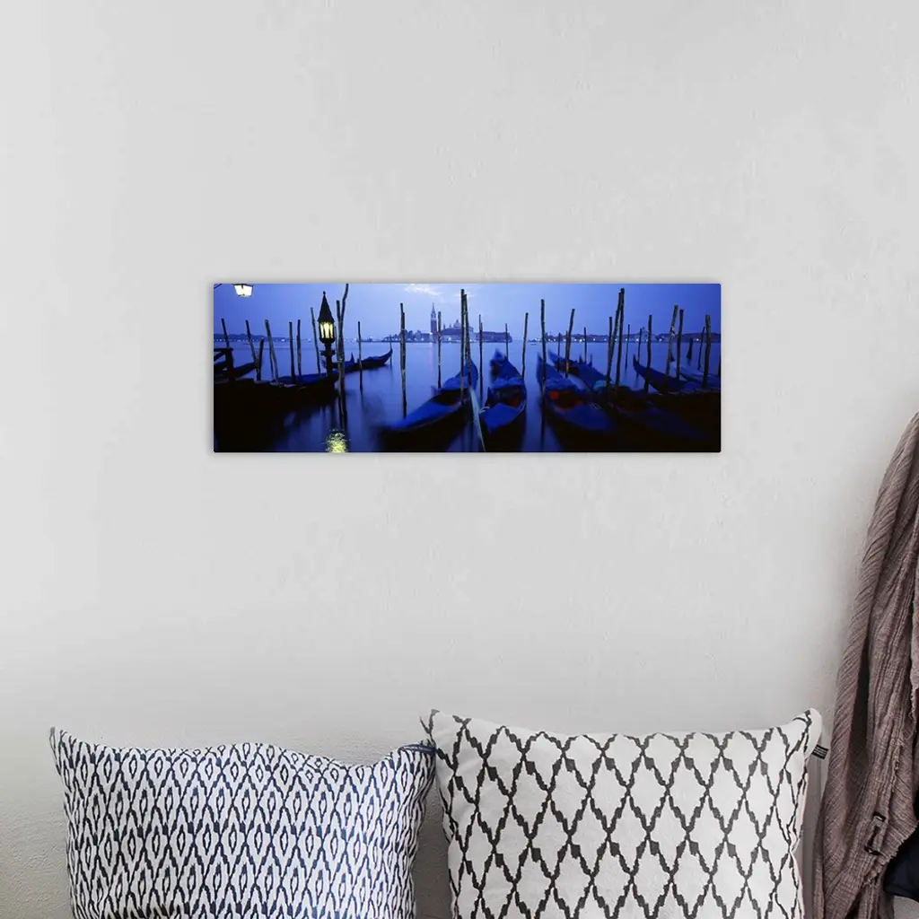Line of gondolas moored against posts in the evening lit only by a single lamp and moonlight.