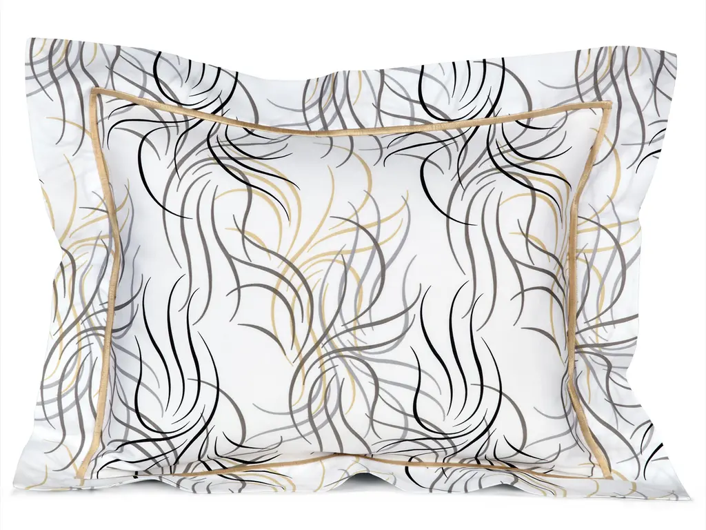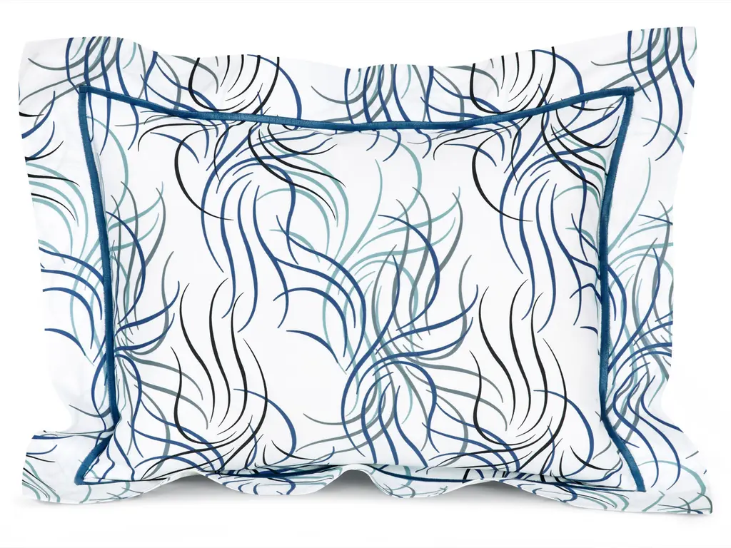 Swirling on a soft background of finely crafted 300 thread count, 100% Egyptian cotton sateen, wisps of slender lines dance in windy currents that will carry you into your own private world of peace and contentment. Bourdon stitching accentuates this flowing design perfectly with regal dimensions. Available in Beige/Black/Gray with Beige bourdon stitch or Blue/Black/Gray with Blue bourdon stitch. Made in Italy.