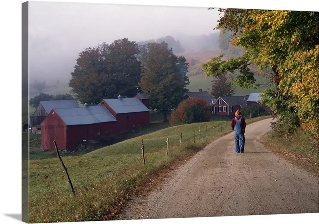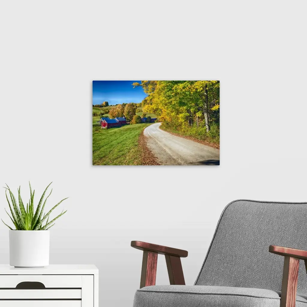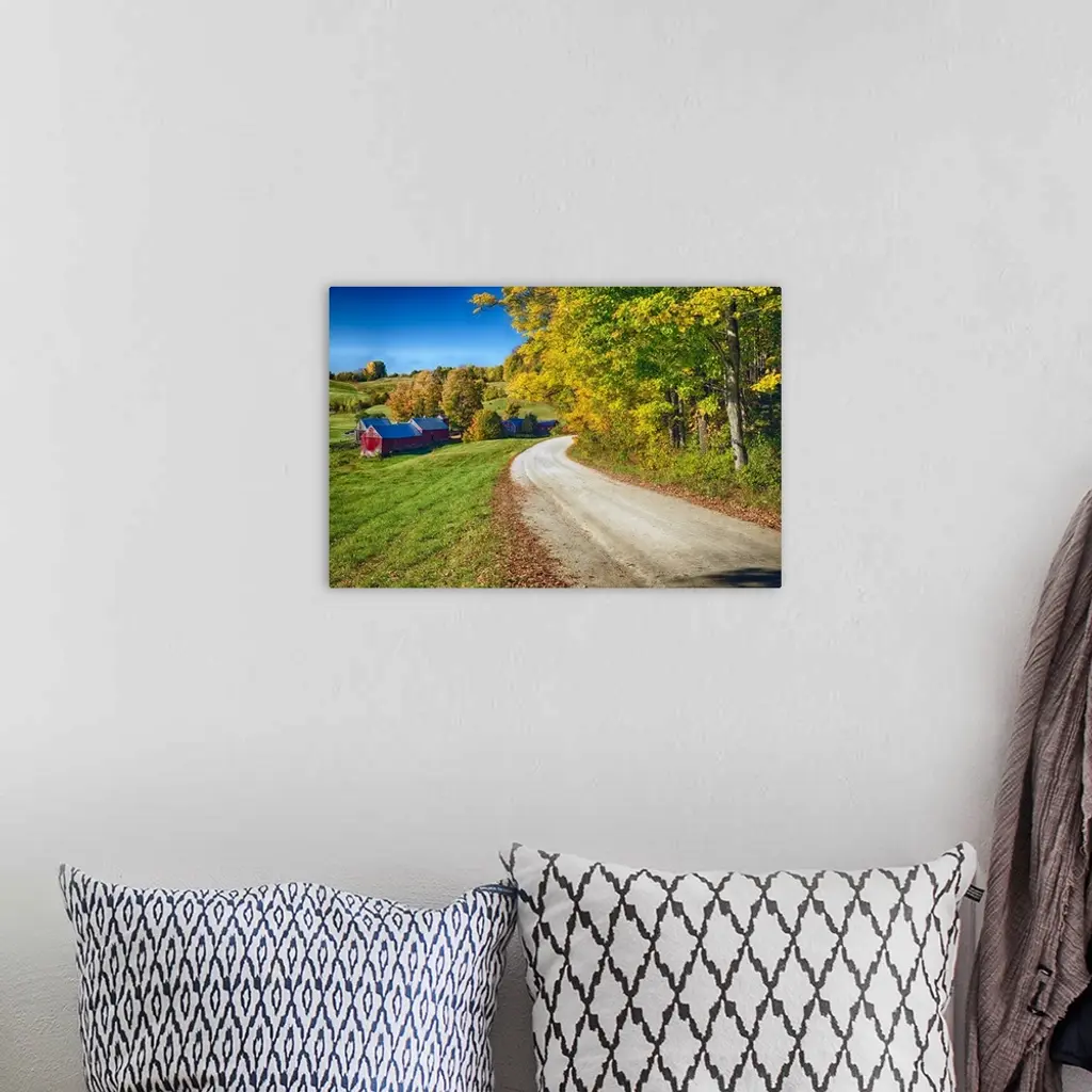 Old road going around a corner in the Vermont countryside, with a red barn in the distance.