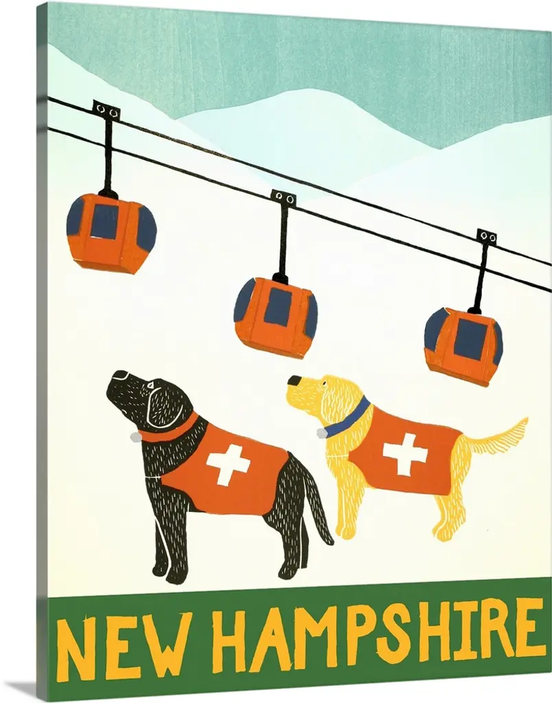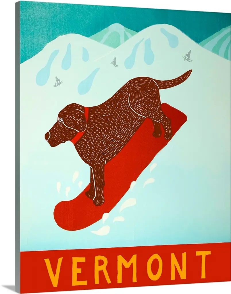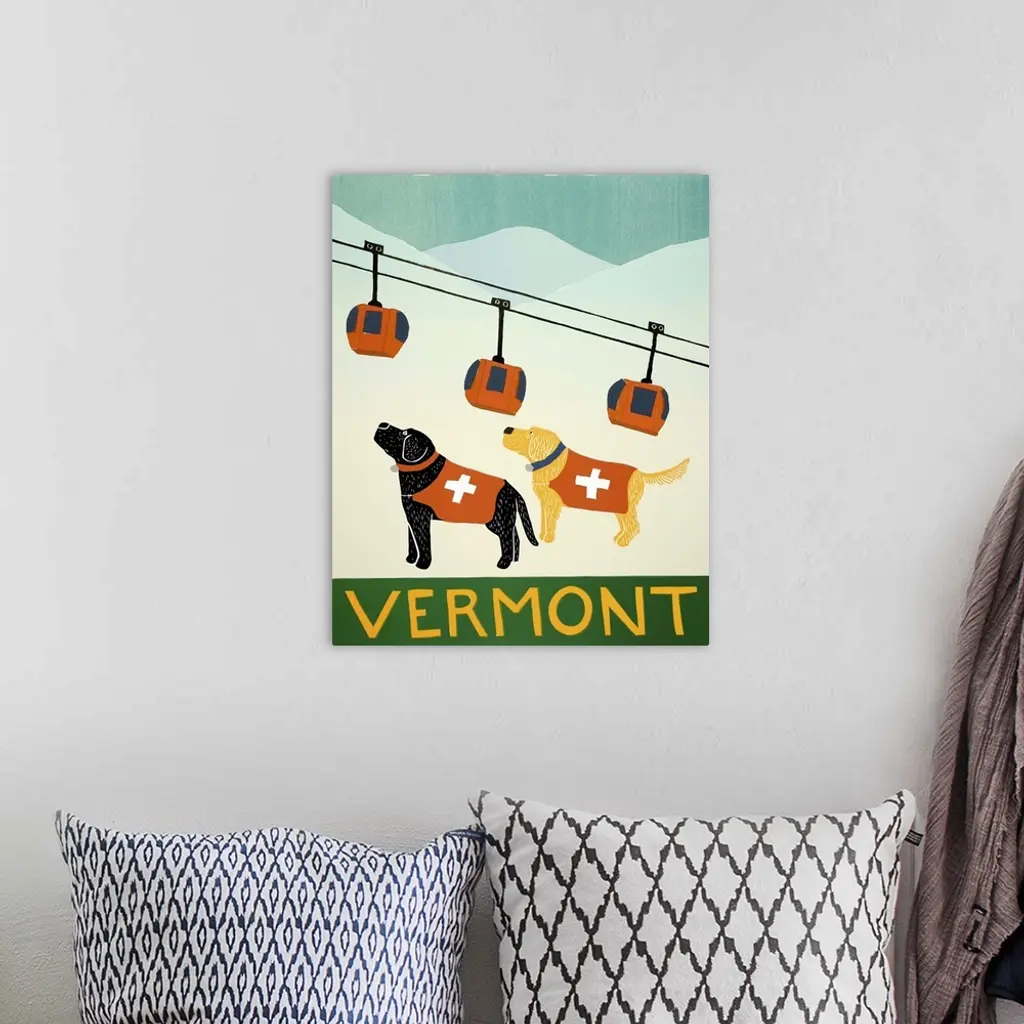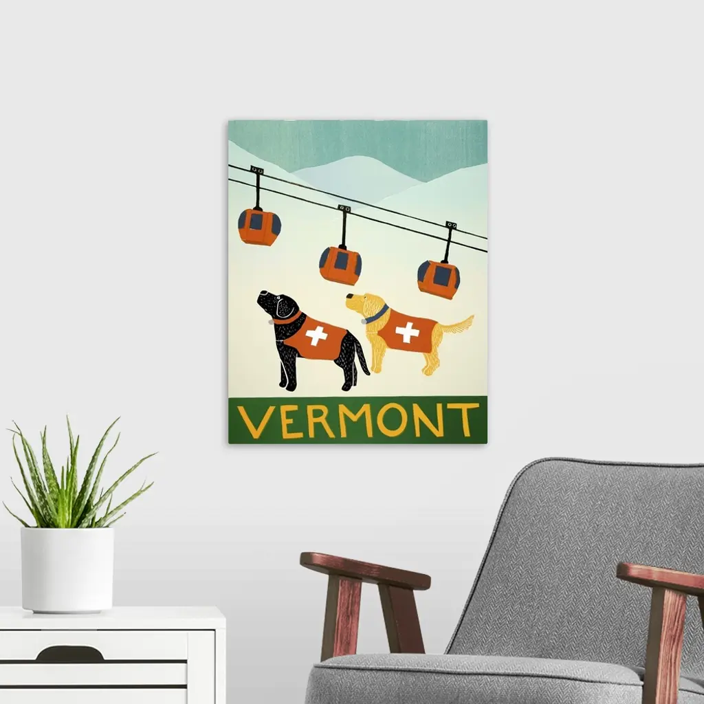 Illustration of a black and yellow lab dressed as ski patrol looking up the slopes with a ski lift in the background and "Vermont" written at the bottom.