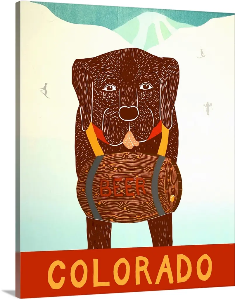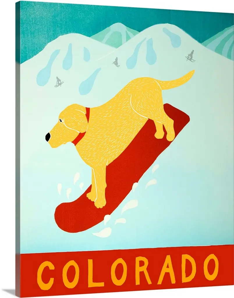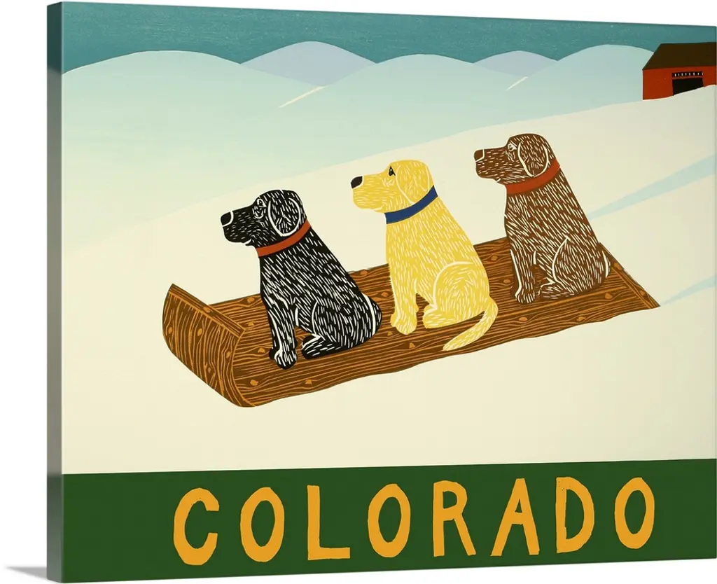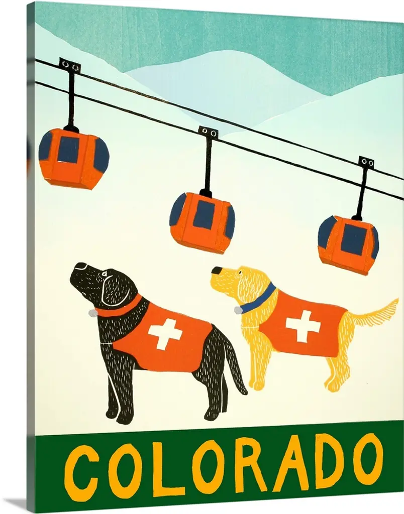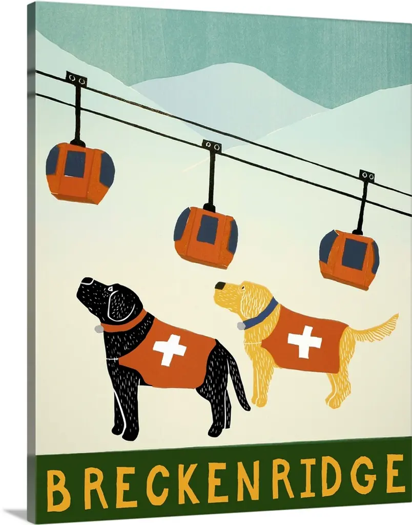 Illustration of a black and yellow lab dressed as ski patrol looking up the slopes with a ski lift in the background and "Vermont" written at the bottom.