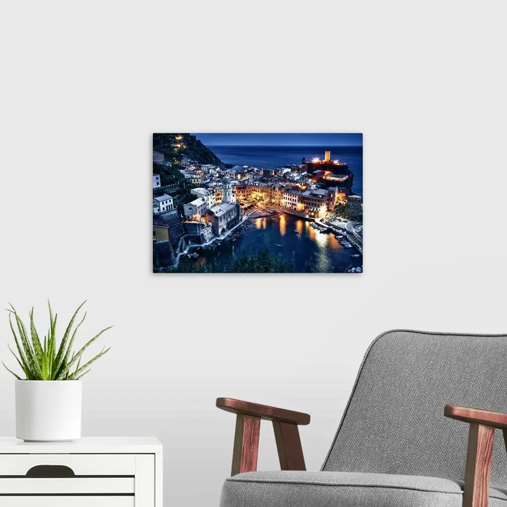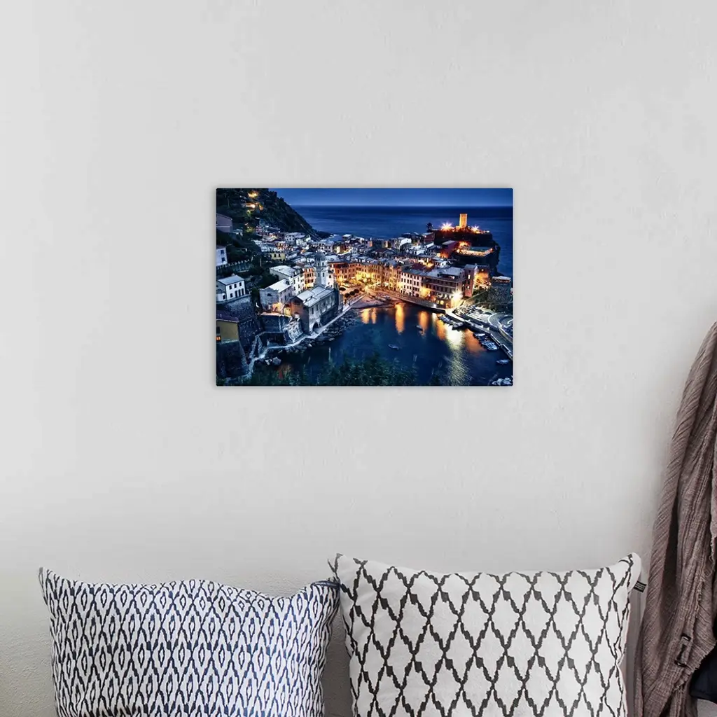 Aerial view of a seaside town in Cinque Terre, Italy at night with houselights lighting up the night. Boats, the sea, cliff wall, roads, and the town plaza are all visible.